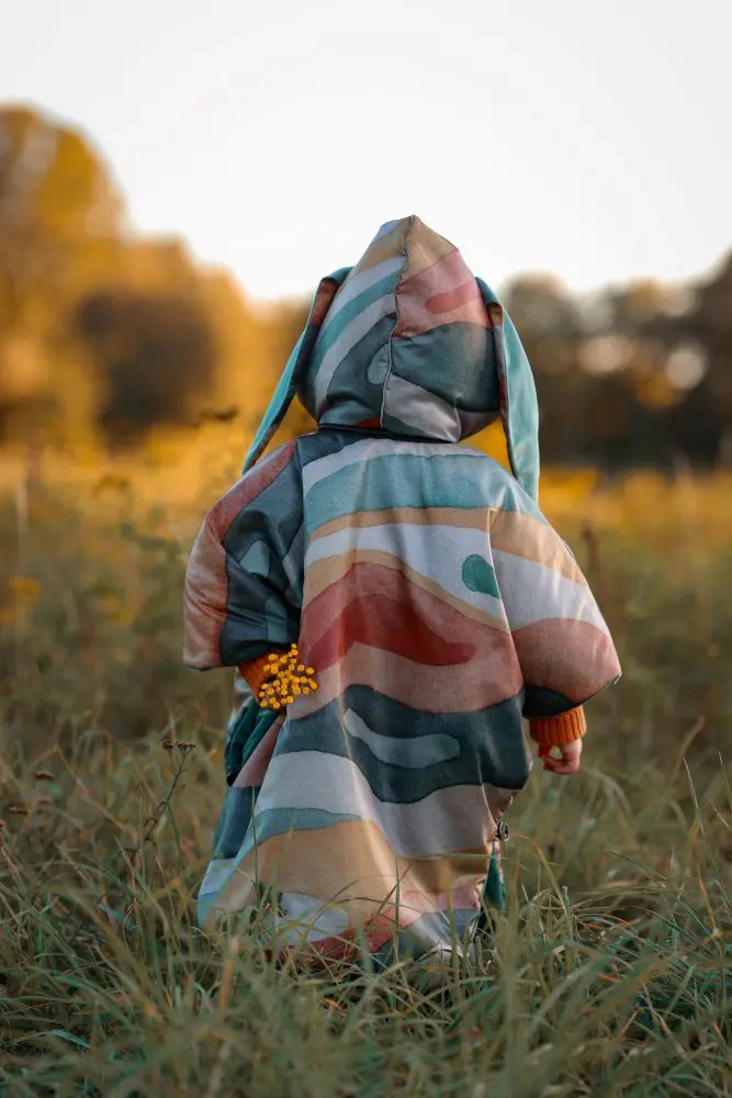• Praktyczność i wygoda: Zamek błyskawiczny rozpinany od góry i od dołu ułatwia zakładanie i zdejmowanie poncza, a odpinany kaptur pozwala dostosować go do potrzeb dziecka i pogody. Mocne zapięcia magnetyczne pod pachami i dodatkowe guziki i gumeczki w talii dziecka gwarantują, że ponczo pozostanie na swoim miejscu, nie krępując ruchów malucha.