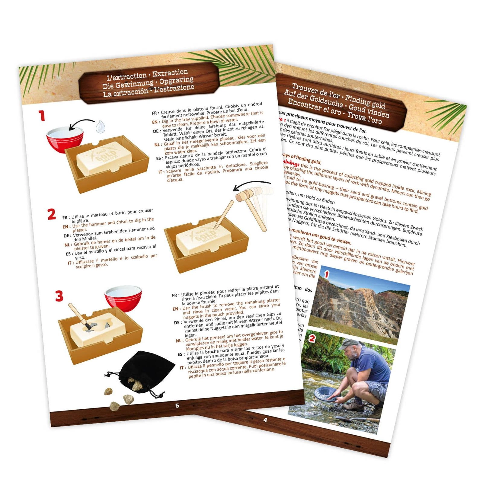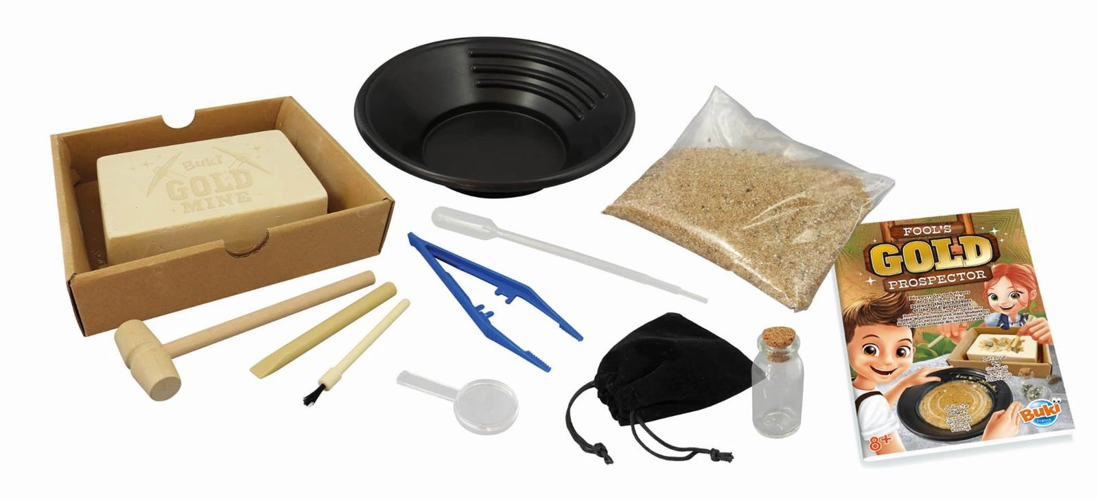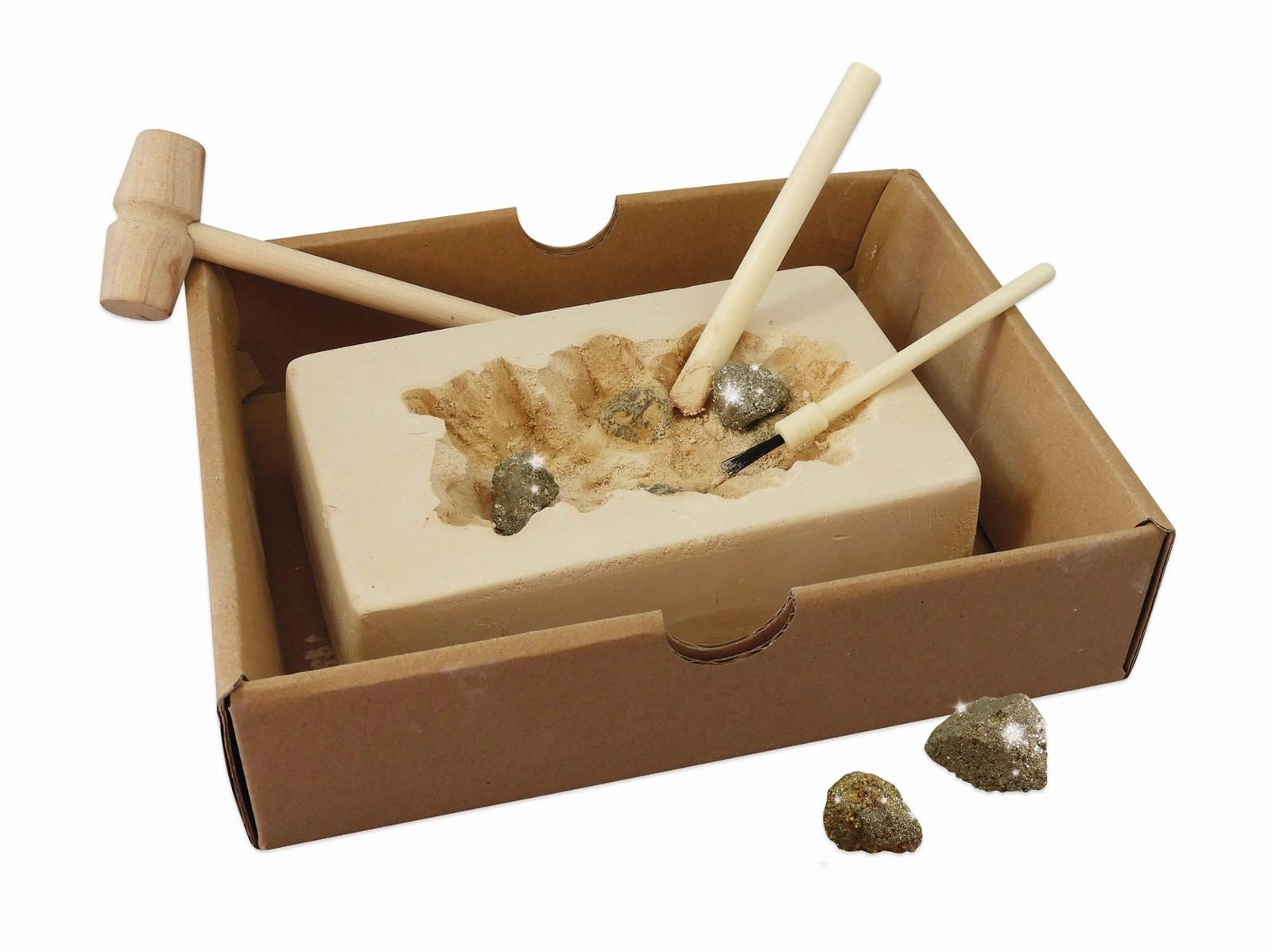 W zestawie: - miska do płukania, - szkło powiększające, - pipeta, - szczypce, - torebka z piaskiem, - buteleczka z korkiem, - gipsowy blok do odkopania bryłek, - młotek, - dłuto, - pędzelek, - tekturowa tacka do kopania bez bałaganu, - instrukcja krok po kroku.