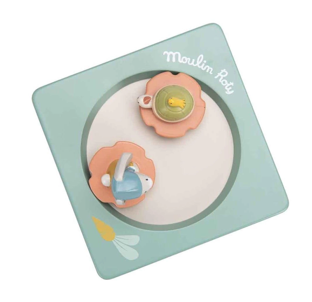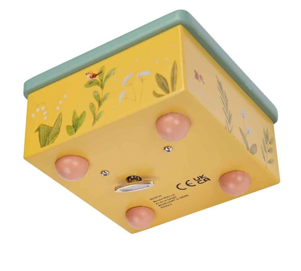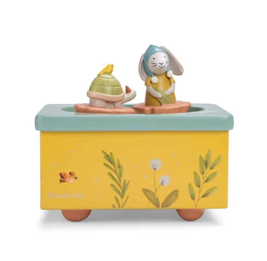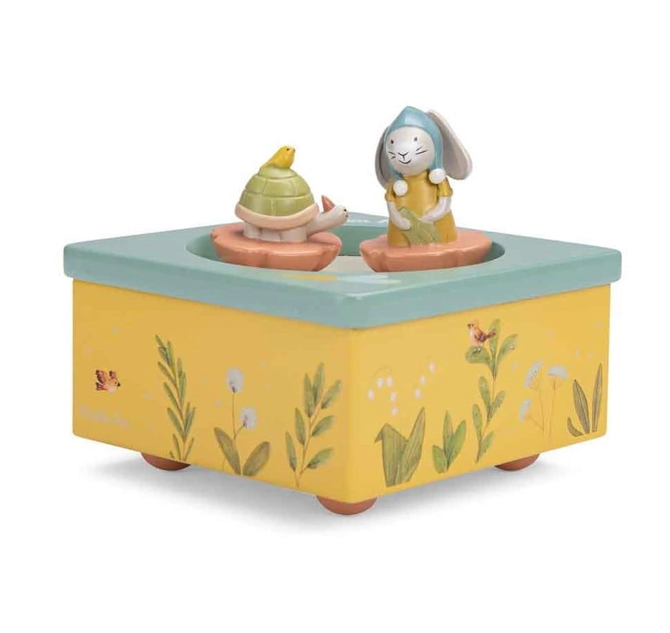 Pozytywkę nakręca się za pomocą metalowego uchwytu - wówczas zaczyna grać delikatna melodyjka, a króliczek i żółw wirują w rytm delikatnych dźwięków pozytywki.