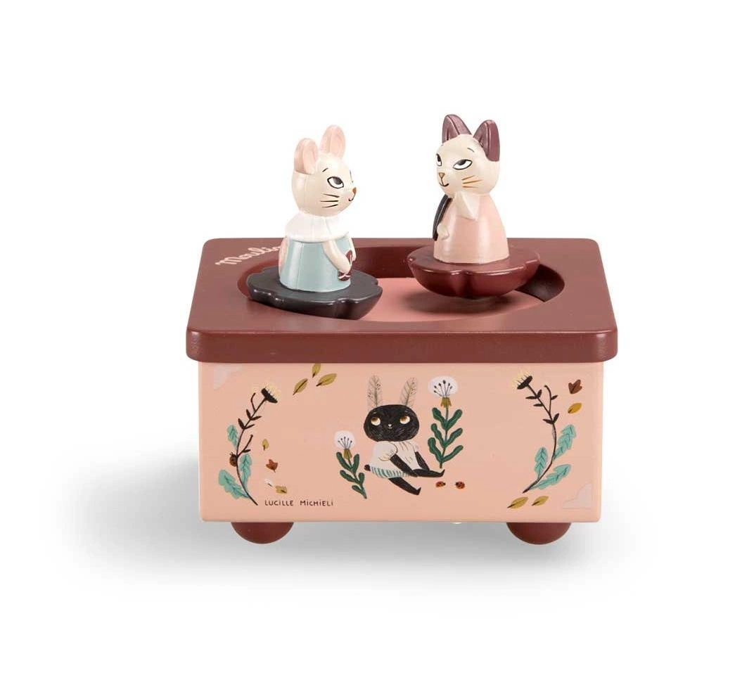 Pozytywka z serii APRES AL PLUIE ma formę drewnianej skrzyneczki. Pozytywkę nakręca się za pomocą metalowego uchwytu - wówczas zaczyna grać delikatna melodyjka, a 2 figurki kotka i myszki umieszczone na wierzchu pozytywki zaczynają wirować wokół własnej osi. Pozytywka jest utrzymana w charakterystycznej dla kolekcji kolorystyce różowo-bordowej, a boki ilustrowane są wizerunkami kotków - bohaterów serii. Idealne wyposażenie dziecięcego pokoju.