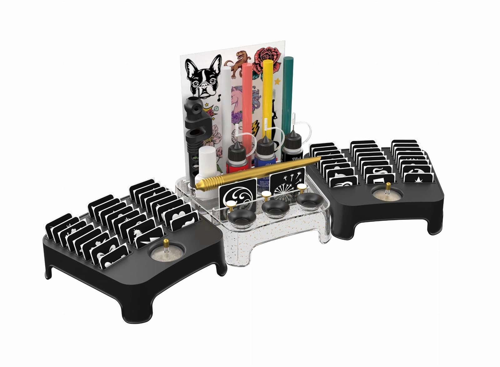 Wielorazowe wzory tatuaży należy umieścić na skórze i pokolorować załączonymi tuszami za pomocą narzędzi imitujących prawdziwe maszynki do robienia tatuaży.