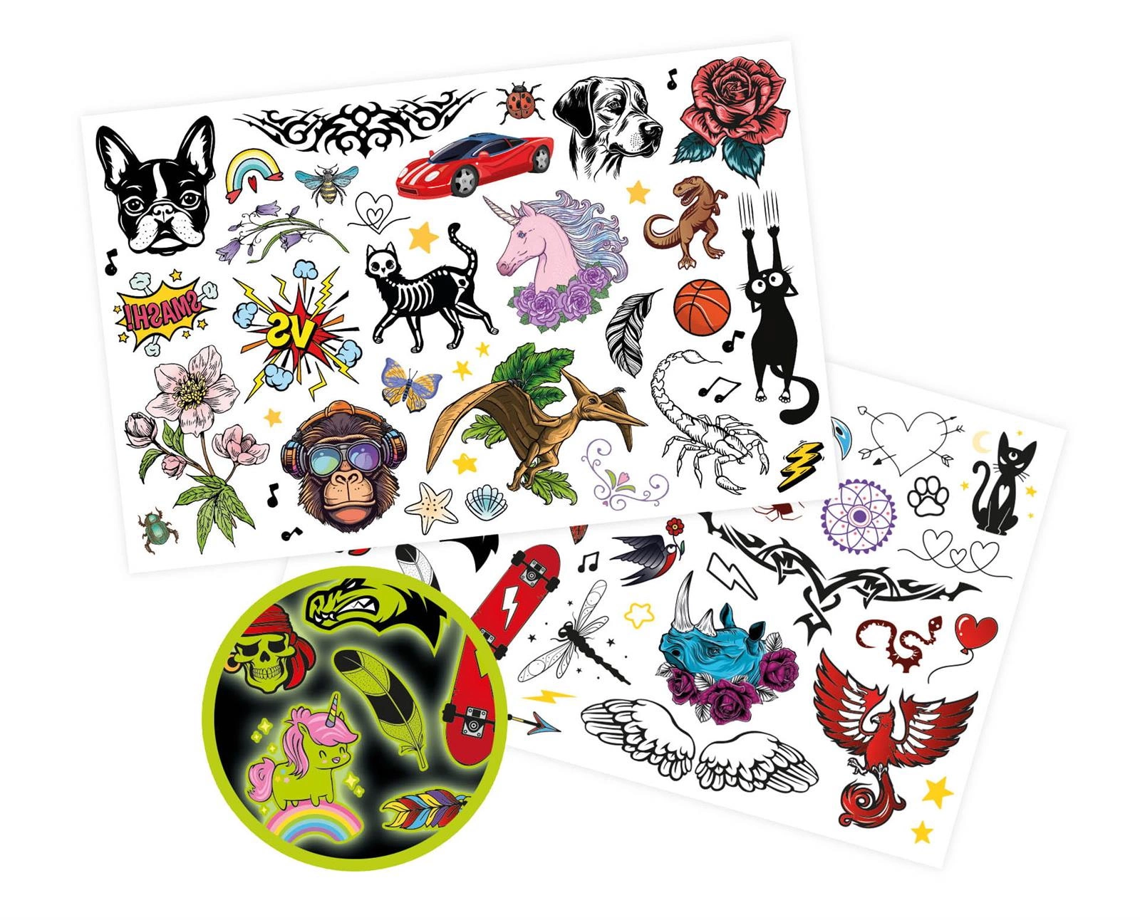 Można wykorzystywać podane wzory lub rysować tatuaże samodzielnie, jak prawdziwy artysta. W zestawie znajduje się brokat do ozdobienia tatuaży oraz gotowe, zmywalne tatuaże świecące w ciemności.