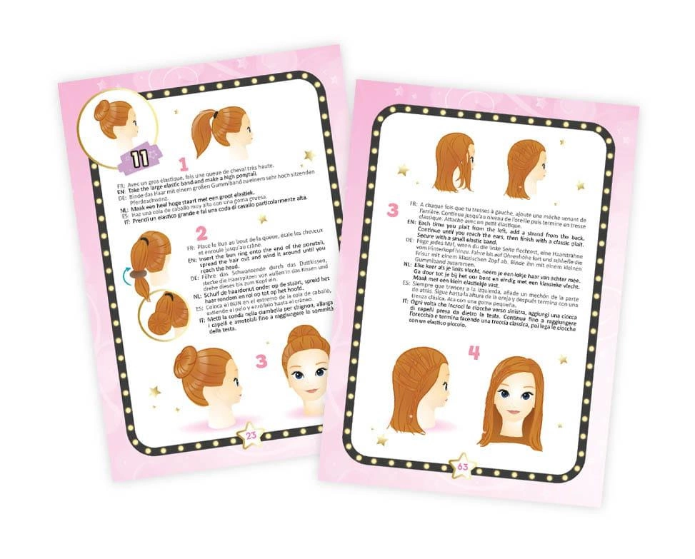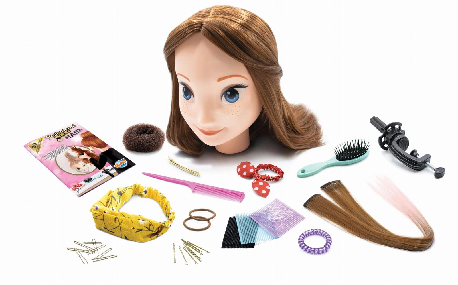 Główka fryzjerska do ćwiczenia różnych stylizacji, z bardzo realistycznym wzorem wzrostu włosów. Główkę mocuje się do blatu uchwytem, aby nie poruszała się w czasie zabawy. 30 różnych stylizacji fryzur do wypróbowania na główce lalki, a następnie na sobie lub przyjaciółce.