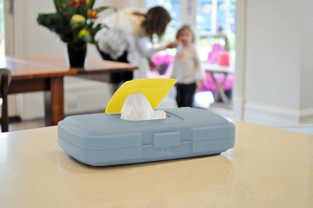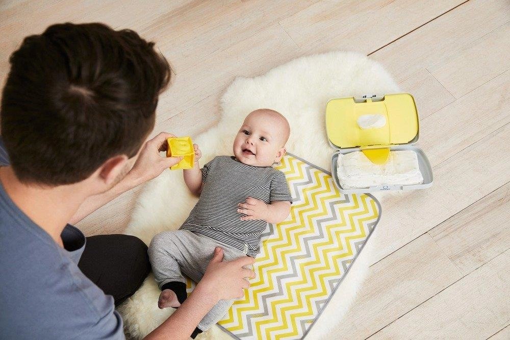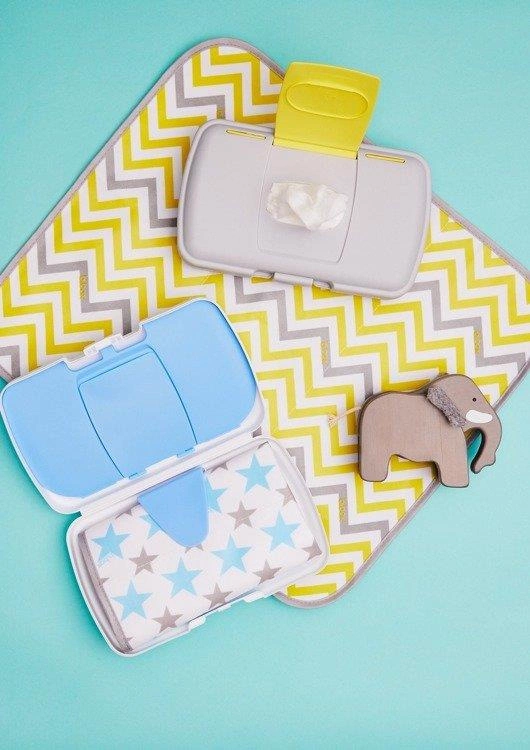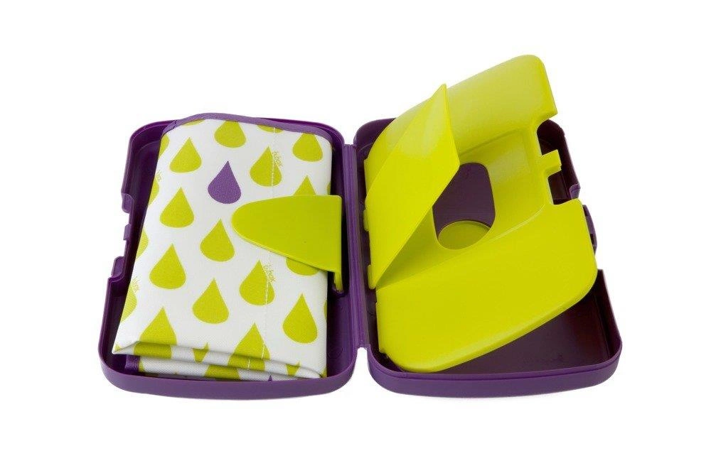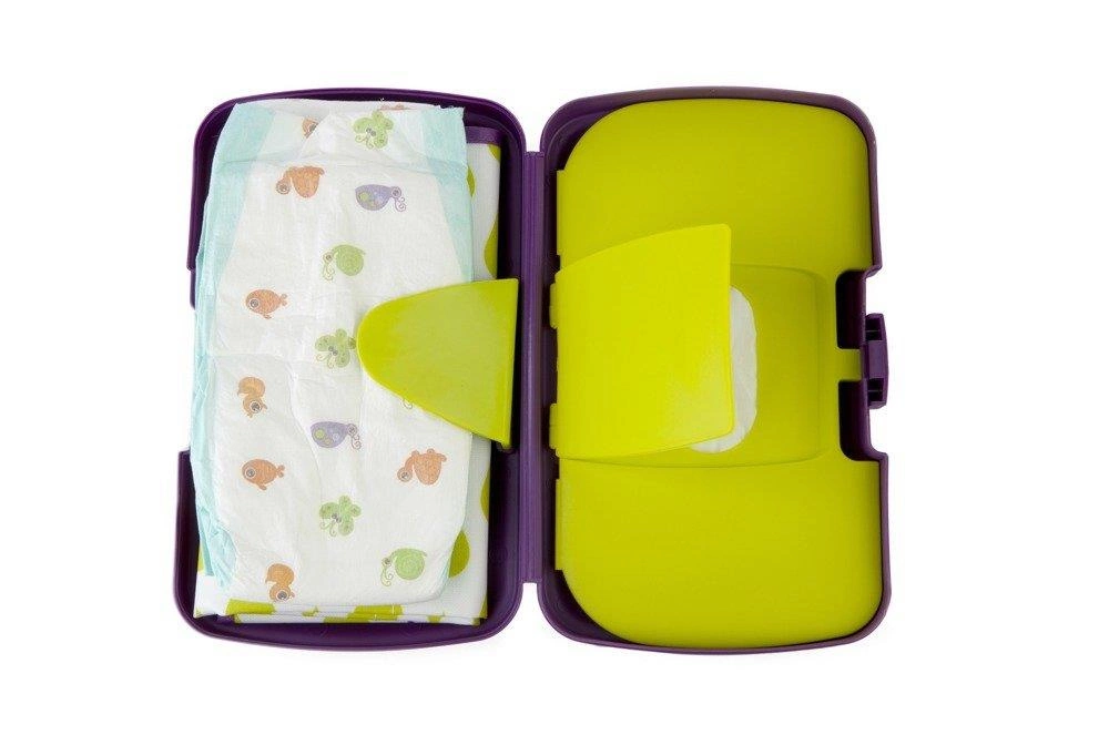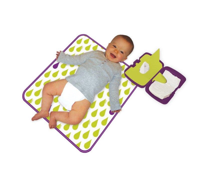 Podróżny przewijak - bardzo wygodny i praktyczny pojemnik otwierany przy użyciu jednej ręki. Nazwany przez producenta "diaper wallet" co oznacza portfel na pieluszki i tak faktycznie jest - zmieści się do torebki damskiej czy plecaka. Pojemnik zawiera łatwą do czyszczenia matę do przewijania. Wewnątrz pojemnika znajdują się wbudowane przegródki z miejscem na pampersy, wilgotne chusteczki i woreczki jednorazowe. Wszystko co niezbędne do przewijania w jednym miejscu. Unikalnie zaprojektowany luk zapewnia dostęp do wilgotnych chusteczek zarówno z zewnątrz jak i wewnątrz pudełka. Sprężysty uchwyt utrzymuje matę oraz pieluszki na właściwym miejscu.