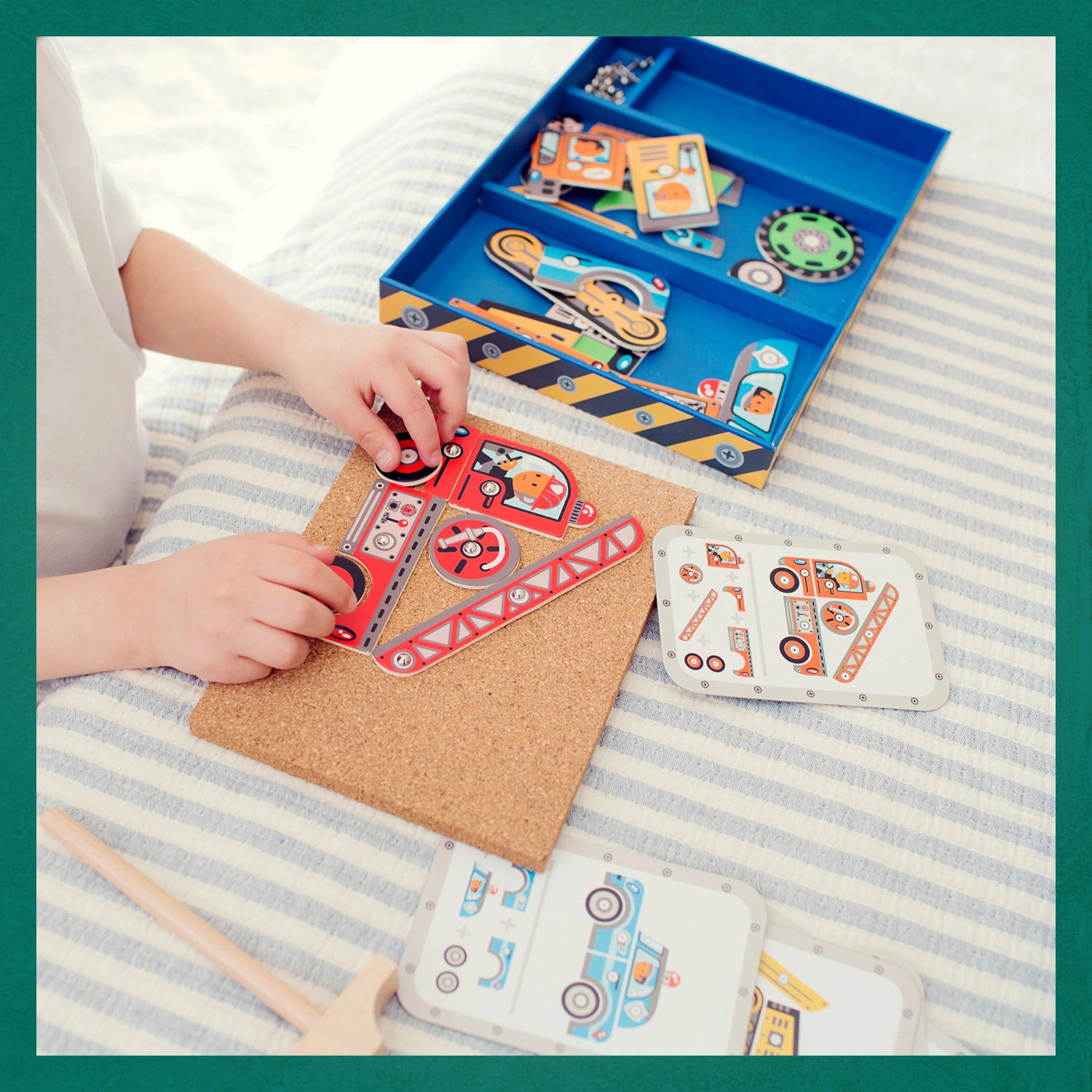 Fantastyczny zestaw dla młodego konstruktora,majsterkowicza. Według instrukcji lub własnego pomysłu należy zbudować pojazd, a następnie przybić go do korkowej tablicy.