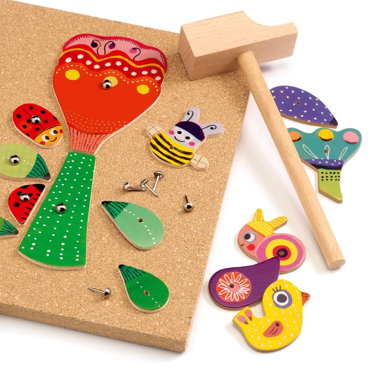 Zestaw kreatywny do tworzenia Ogrodu. W zestawie tablica korkowa, bezpieczne pinezki, drewniany młoteczek, Karty- wzorniki oraz kartonowe elementy do tworzenia kwiatów, drzew, ptaszków.