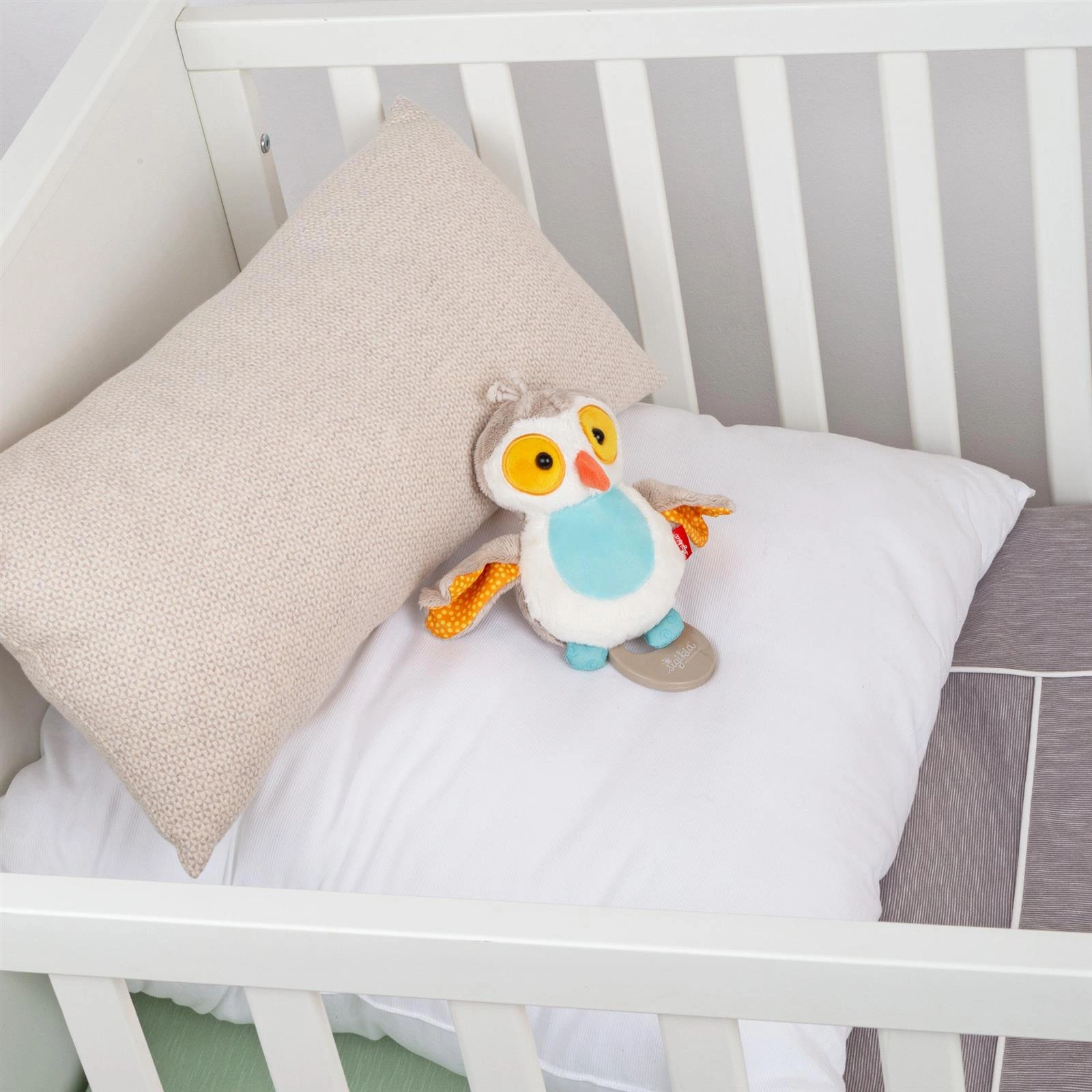 Grająca przytulanka sowa śnieżna zachwyca przyjaznym wyglądem i kojącą melodią z filmu Harry Potter. Uszyta z organicznej bawełny, została wyposażona w gładkie kółko wykonane z drewna bukowego, którego pociągnięcie uruchamia pozytywkę.