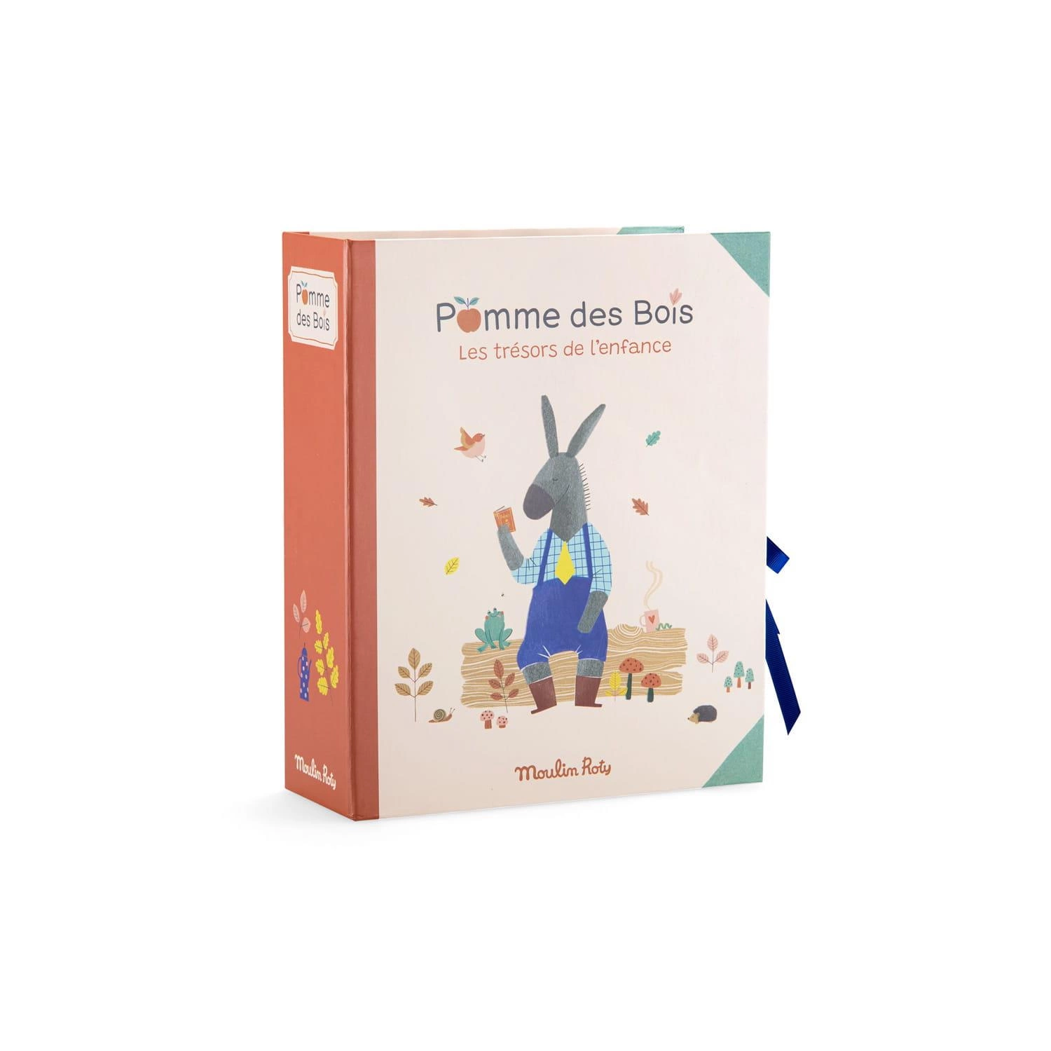 Pudełko prezentowe w odcieniach pełnych słodyczy i delikatności gamy "POMME DES BOIS". Przedstawia się jako książka zawierająca małe szuflady przeznaczone na wszystkie cuda dzieciństwa: pierwsze pasmo włosów, pierwsze buciki, pierwsze pamiątki i drzewo genealogiczne do uzupełnienia na tylnej okładce. Mała koperta w kształcie tektury umożliwia wpisanie imienia dziecka.
