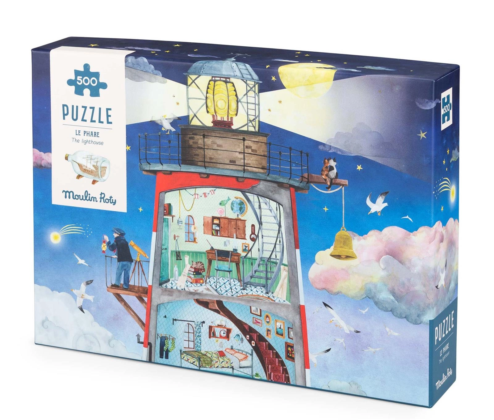 Ahoj przygodo! Bajecznie ilustrowane puzzle przedstawiają przekrój latarni morskiej. 4 piętra skrywają wiele tajemnic do odkrycia. Wzburzone morze okala latarnię wokół której zgromadziły się mewy, różnego rodzaju rybki oraz łodzie rybackie. Prostokątny obraz po ułożeniu posiada wymiary 40 x 72 cm. Wyjątkowa grafika będzie cieszyć oko dzieci 8. roku życia. Puzzle posiadają aż 500 elementów. Wyprodukowano w Europie.