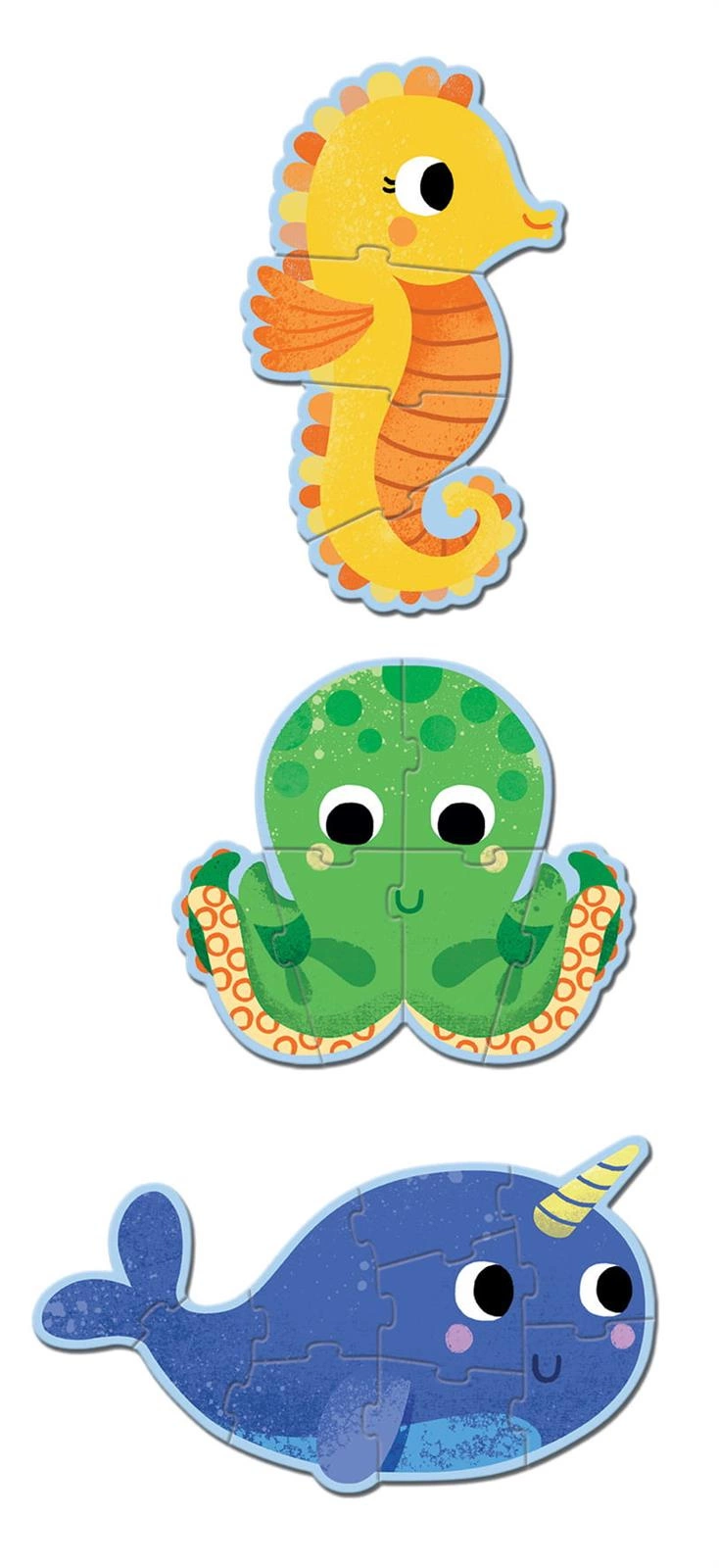 „W MORZU” progresywne układanki 4,6 i 9 elementowe. Puzzle przedstawiają zwierzątka mieszkające w morzu. Delfin składa się z 9, ośmiornica z 6, a konik morski z 4 elementów . Ćwiczą sprawność manualną ręki.