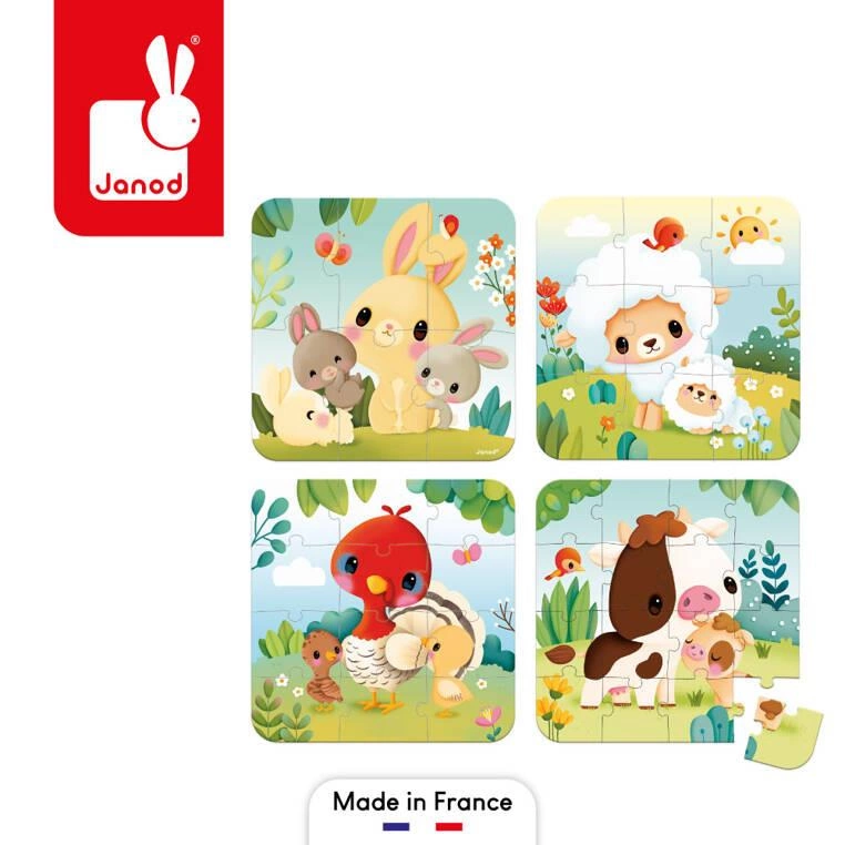Zestaw puzzli progresywnych Zwierzątka na farmie francuskiej marki JANOD składa się z 4 układanek o różnym stopniu trudności. Puzzle liczą sobie kolejno coraz więcej elementów (6, 9, 12 i 16), dzięki czemu dzieci stopniowo uczą się radzić sobie z trudniejszymi układankami. Wszystkie obrazki przedstawiają grupy zwierząt gospodarskich: krówki, owieczki, zajączki i indyki. Puzzle wykonane są z solidnego kartonu FSC, zaprojektowane i wyprodukowane we Francji. Zapakowane w estetyczną walizeczkę z rączką. Idealnie nadają się na prezent.