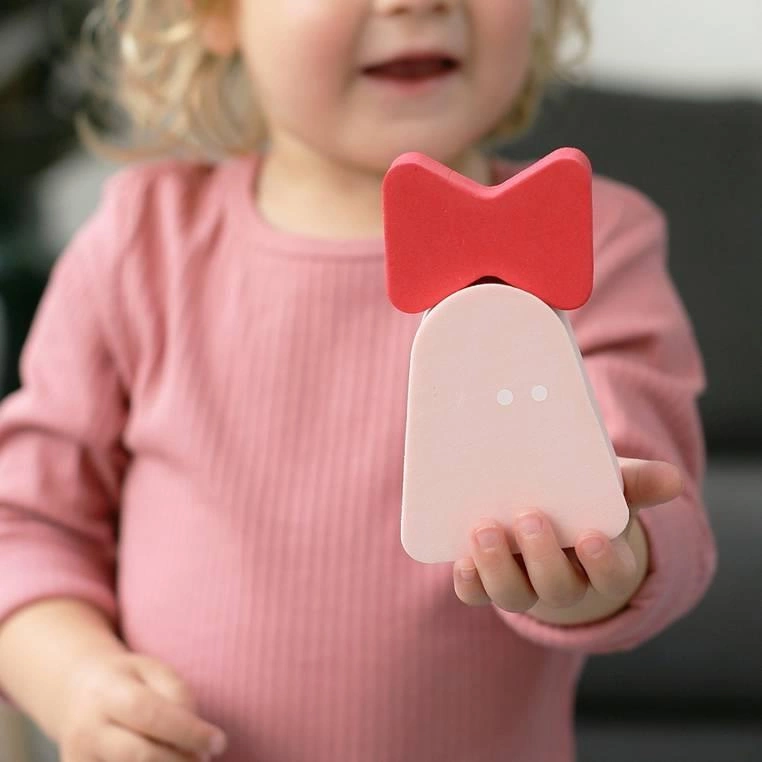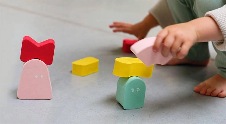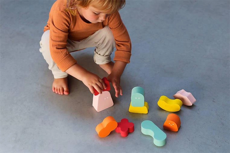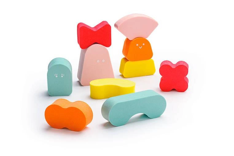 Zestaw klocków balansowych Blokki belgijskiej marki Quut składa się z 10 elementów - brył w różnych geometrycznych kształtach z zaokrąglonymi brzegami, wykonanych z pianki EVA. Wszystkie klocki są miękkie, lekkie i łatwe utrzymania przez dziecko. Należy z nich utworzyć jak najwyższą konstrukcję, odpowiednio balansując bryłami na jej kolejnych poziomach – tak, aby żaden z elementów nie spadł (nawet spadając nie niszczą podłogi i są bezpieczne dla małego dziecka), a całość jak najdłużej zachowała równowagę. Maluch ćwiczy w ten sposób koncentrację, wyobraźnię, logiczne myślenie i zręczność. Dodatkowo trzy klocki mają buźki, dzięki czemu mogą również odgrywać rolę postaci w snutych przez dziecko (lub rodzica) opowieściach. Całość przyciąga wzrok niebanalnym designem i oryginalną kolorystyką.