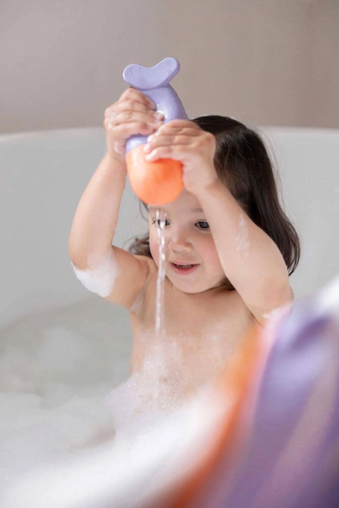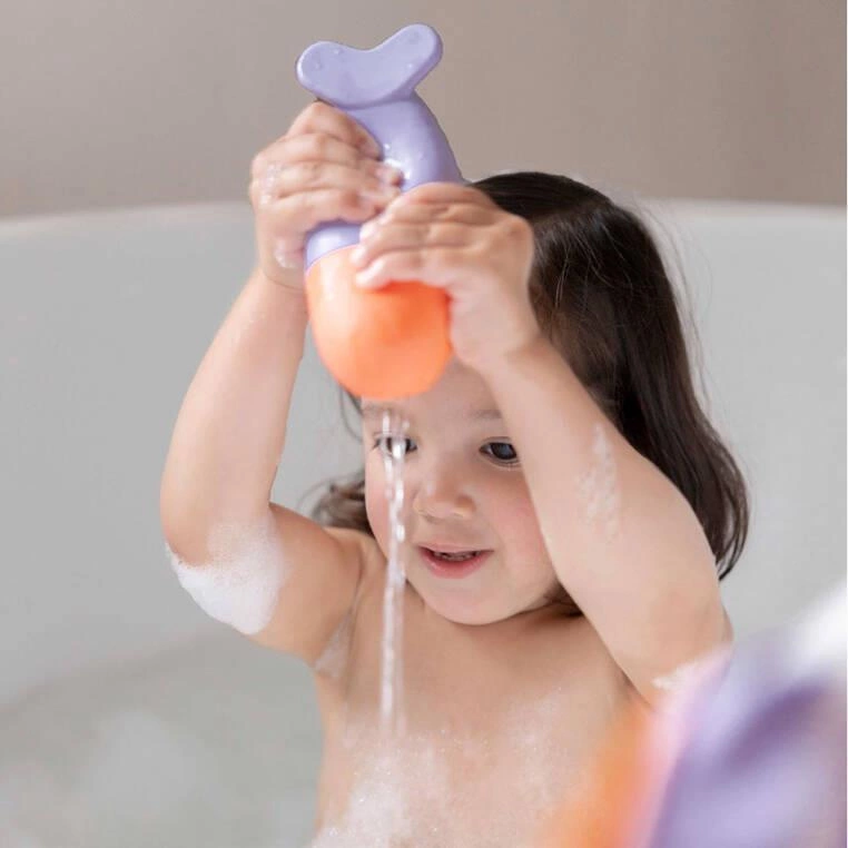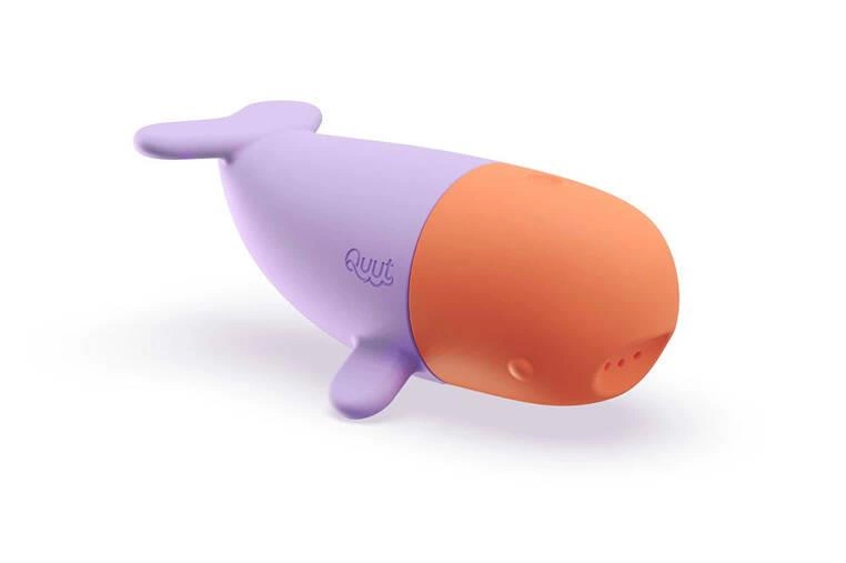 Silikonowy wieloryb Squeezi Whale belgijskiej marki Quut to innowacyjna zabawka do kąpieli. Zadziwia pomysłowością, rozwija małą motorykę (m.in. chwyt i koordynację ręka-oko), ciekawość i kreatywność, przyciąga wzrok niebanalnym designem i kolorystyką. Wieloryb składa się z tułowia (w kolorze lawendowym) i głowy (koralowej), które można rozdzielać dla łatwiejszego umycia. Wykonany został z miękkiego i bezpiecznego silikonu. Ma otwory, przez które napełnia się wodą podczas zanurzania, a następnie po naciśnięciu – można z niego tę wodę wylewać. W zależności od poziomu napełnienia wodą wieloryb może się unosić na powierzchni lub pływać częściowo lub całkiem zanurzony (wielofunkcyjny). Ma wydłużony kształt, stymulujące sensorycznie płetwy i ogon oraz optymalne dla małej rączki rozmiary. Nadaje się idealnie do zabaw w wannie, pod prysznicem lub w przydomowym basenie. Jest lekki i szybko schnie.
