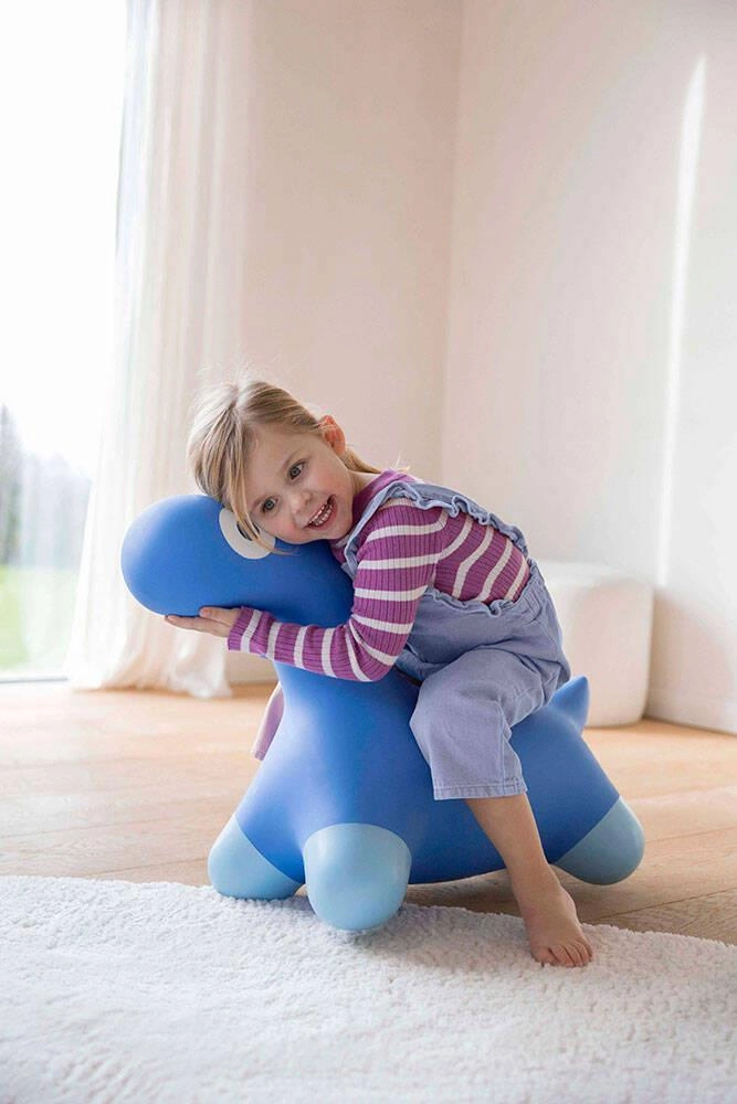 Oryginalny, sporych rozmiarów dmuchany skoczek Hoppi Dino belgijskiej marki Quut to świetna i rozwojowa rozrywka dla aktywnych maluchów. Idealny do domu, ogrodu lub na taras. Łatwy do napompowania (pompka w zestawie) i transportu. Skoczek przeznaczony jest dla dzieci od 2. roku życia (siedzisko na wysokości ok. 26 cm). Wykonany z bardzo wytrzymałego winylu, zachwyca niebanalnym designem i kolorystyką. Ma kształt wydłużonego uroczego dinozaura (duże oczy i wypustki na grzebiecie) z poręcznymi uchwytami po bokach głowy oraz piękne, intensywne kolory: lawendowy z jasnolawedowymi stopami, dinowe wypustki zaś są koralowe. Zabawka nadaje się idealnie do treningu równowagi, panowania nad własnym ciałem, koordynacji ruchowej i siły mięśni. Nadaje się także do relaksu na świeżym powietrzu. Pobudza wyobraźnię i kreatywność, zachęca do aktywności, zdobywania nowych doświadczeń i umiejętności.