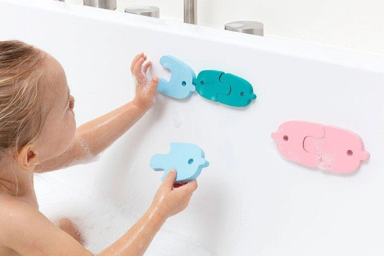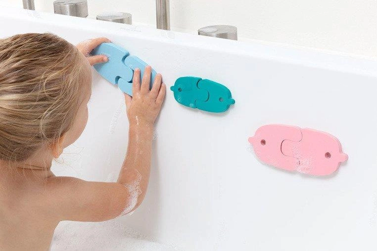Zestaw puzzli piankowych Wieloryb z kolekcji Quutopia belgijskiej marki Quut to innowacyjna zabawka do kąpieli, która zadziwia pomysłowością, rozwija kreatywność, przyciąga wzrok niebanalnym designem i oryginalną kolorystyką. Komplet składa się z 11 puzzli: 2 wielorybów (małego i dużego), 8 rybek (większych i mniejszych) i wodnej fontanny, wykonanych z wyjątkowego materiału, jakim jest pianka EVA, w intensywnych barwach (chabrowy, turkus, niebieski, jasny szary i różowy). Kształty puzzli umożliwiają łączenie ich na różne sposoby (np. rybki można łączyć w pary kolorystyczne, lub umieszczać wewnątrz dużego wieloryba mniejsze elementy), a po zamoczeniu można przyklejać je do powierzchni wanny lub glazury, tworząc przeróżne konstrukcje, oraz bawić się w sposób, jaki tylko podpowie dziecku wyobraźnia. Figurki unoszą się na wodzie, są lekkie i szybkoschnące.