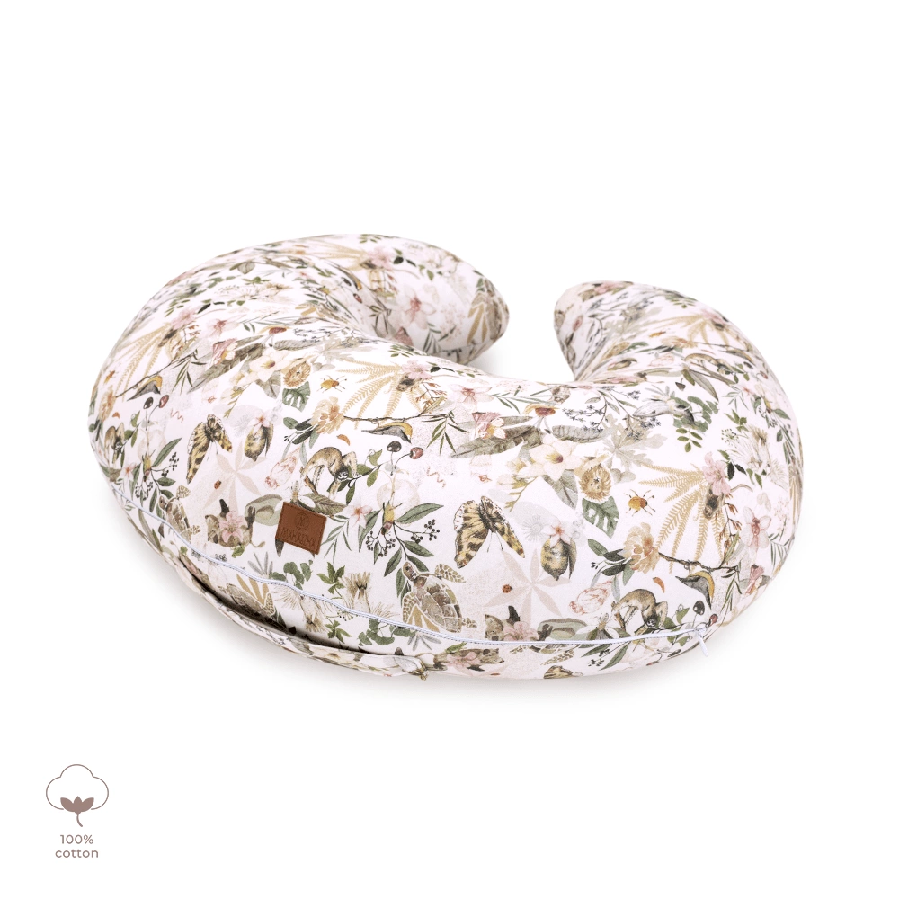 Rogal wykonany jest obustronnie z najwyższej jakości dzianiny bawełnianej, która nie spiera się i nie traci swoich właściwości nawet po wielokrotnym praniu. Poszewka zapinana na bezpieczny suwak jest łatwa do zdjęcia z poduchy i wyprania. W środku bawełniany rogal wypełniony antyalergicznym puchem silikonowym zapewniającym miękkość, a także sprężystość. Wewnętrzna część zapinana jest na niewielki suwaczek dający możliwość regulacji ilości wypełnienia. Dzięki temu poducha idealnie dopasowuje się kształtem i rozmiarem do maluszka i osoby karmiącej.
