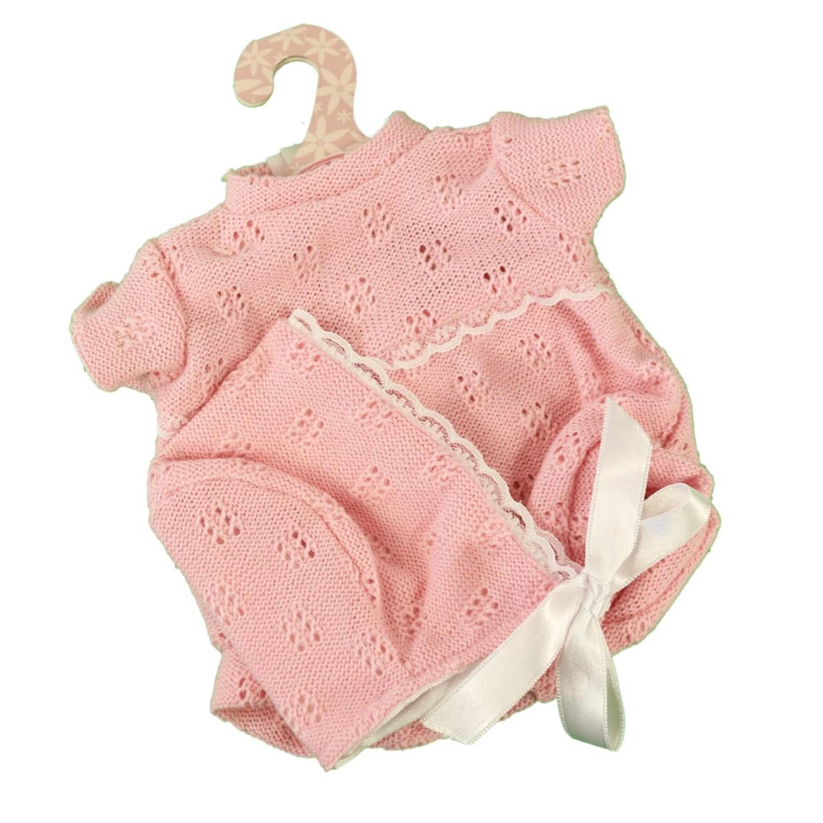 Różowe dzianinowe body z krótkim rękawkiem wspaniale prezentuje się z zestawie z czapeczką wiązaną lśniącą białą wstążeczką. Body jest zapinane z tyłu na rzep. Strój uszyty ręcznie w Hiszpanii w manufakturze Antonio Juan perfekcyjnie wygląda na bobasach o wysokości 33 cm. Wzbogać garderobę lalek hiszpańskich w nowe wysokiej jakości stylowe ubranka.