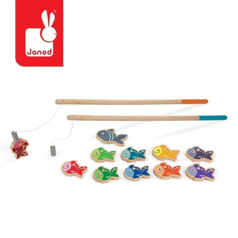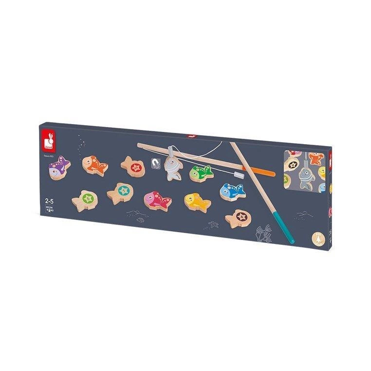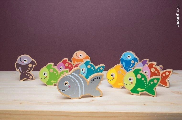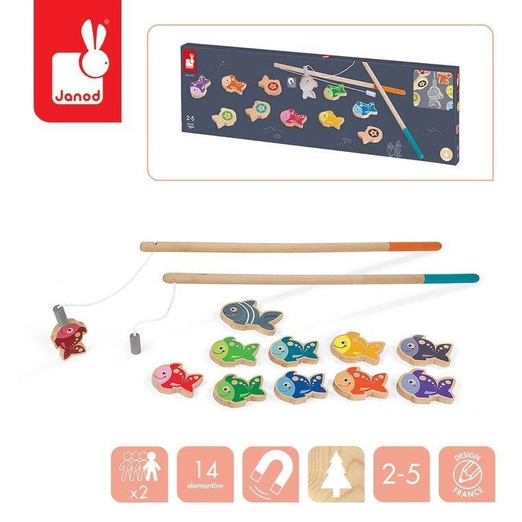 Gra zręcznościowa łowienie rybek francuskiej marki Janod to wspaniała zabawa dla dwójki dzieci lub dziecka i rodzica. Zestaw zawiera 10 drewnianych rybek w pięknych kolorach oraz jednego drewnianego rekina – 2 drewniane wędki zakończone są magnesem, za pomocą którego można łowić rybki. Gra ćwiczy koordynację ruchową, wspiera relację ręka-oko, uczy cierpliwości i skupienia.