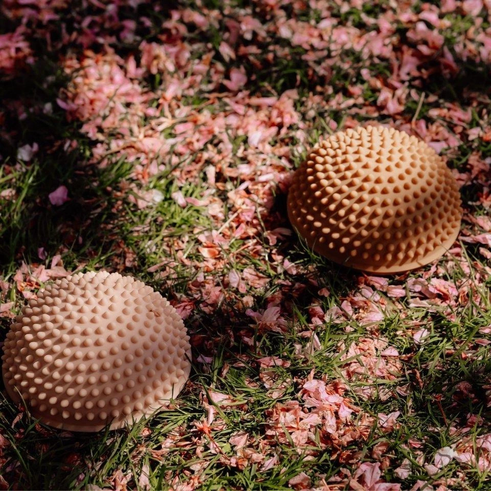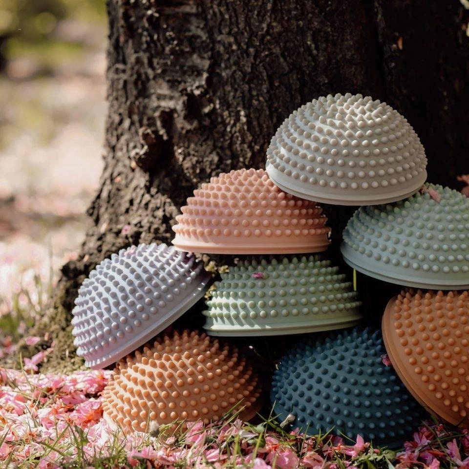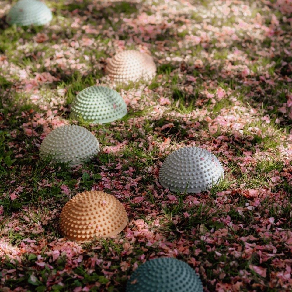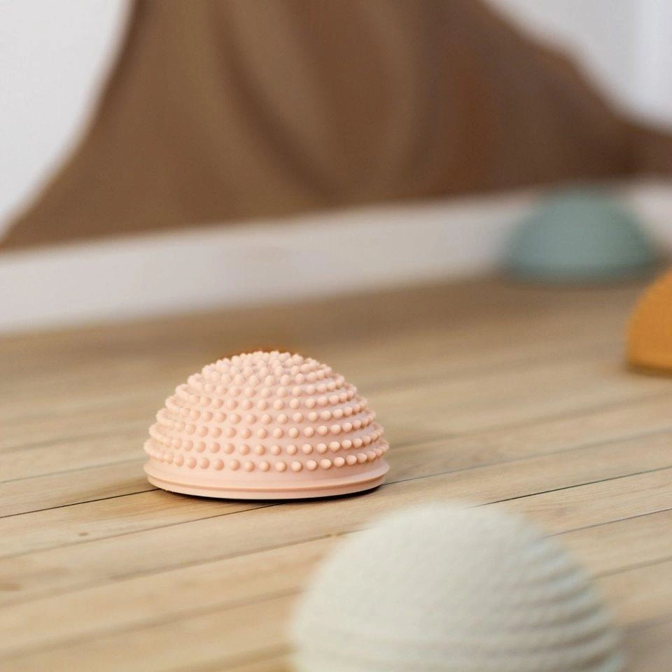 Zestaw czterech półkul sensorycznych, który został stworzony specjalnie do treningu równowagi i rozwijania zdolności ruchowych dzieci od 2 roku życia. Każda półkula ma kształt przypominający kamień: płaski spód zapewnia stabilność na różnych powierzchniach, a zaokrąglona góra oraz małe wypustki są zaprojektowane tak, aby stymulować zmysł dotyku i pomagać dziecku w utrzymywaniu równowagi. Warto zauważyć, że wypustki stymulują receptory czuciowe i wspomagają poprawę krążenia.