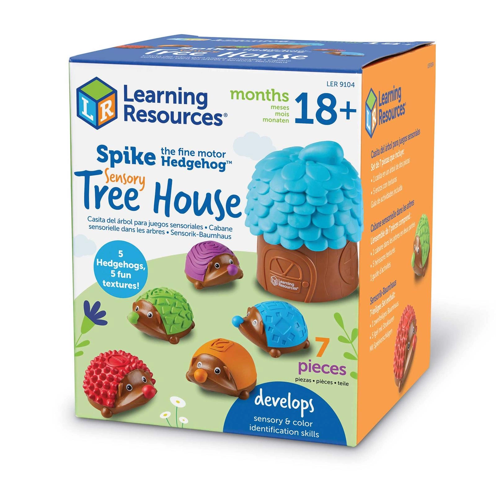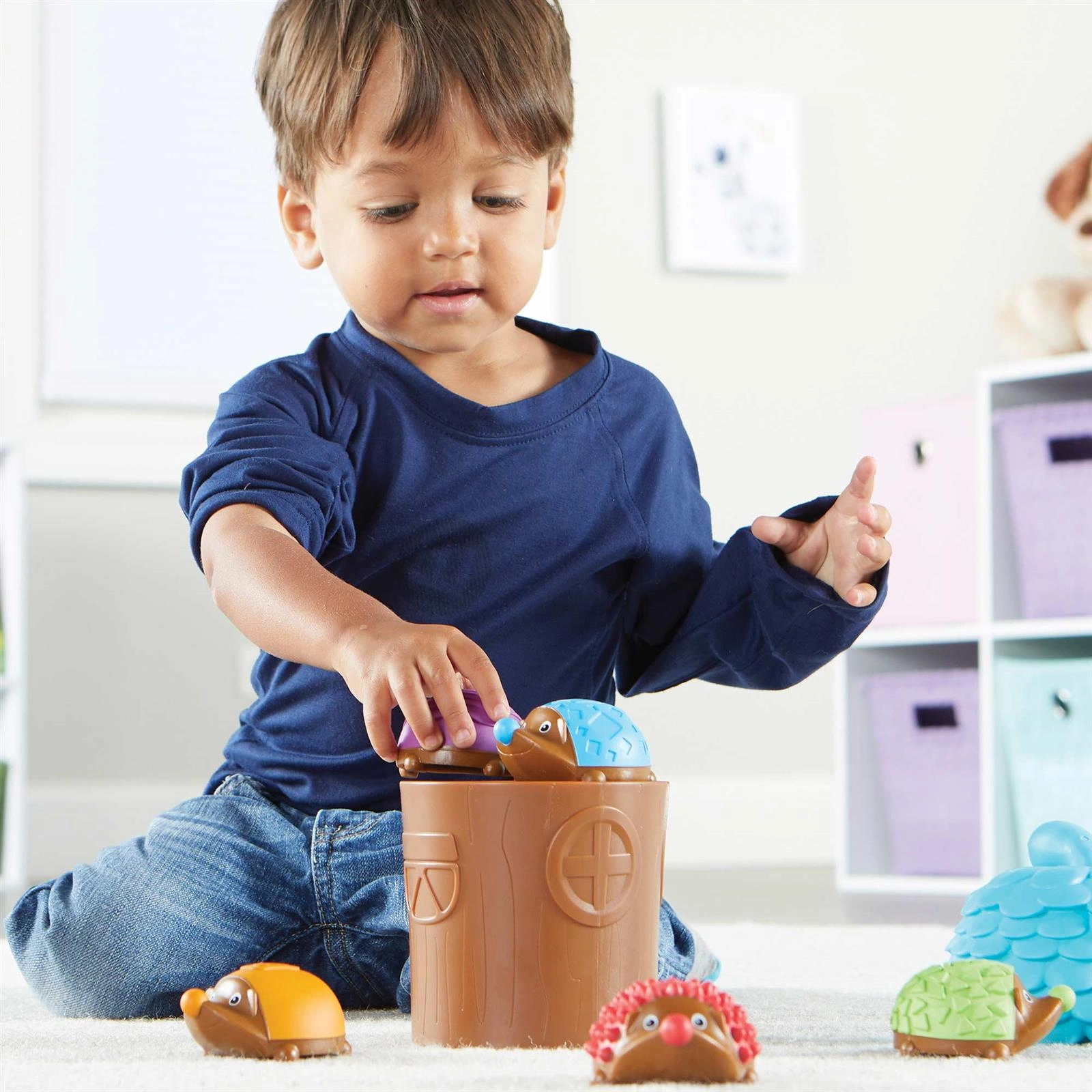 - W zestawie 5 kolorowych jeży z grzbietami o różnej strukturze oraz domek w kształcie żołędzia ze zdejmowanym daszkiem.