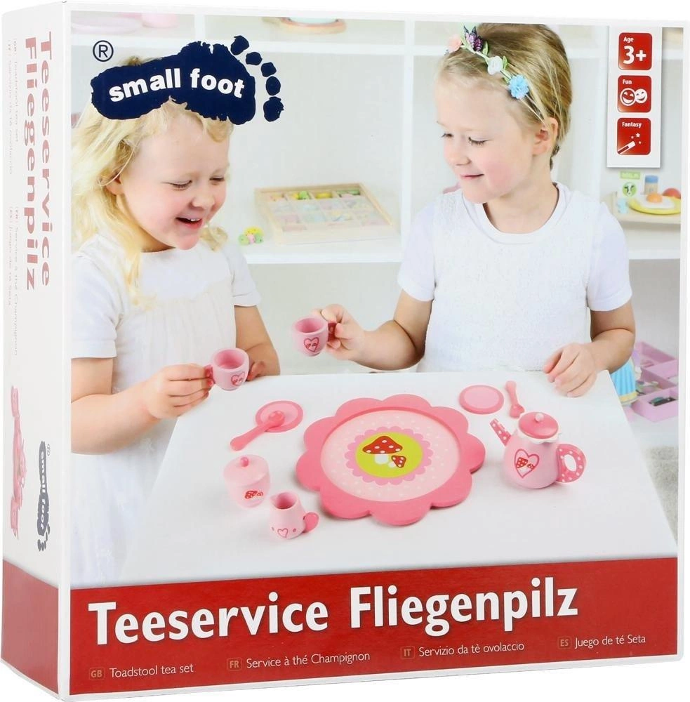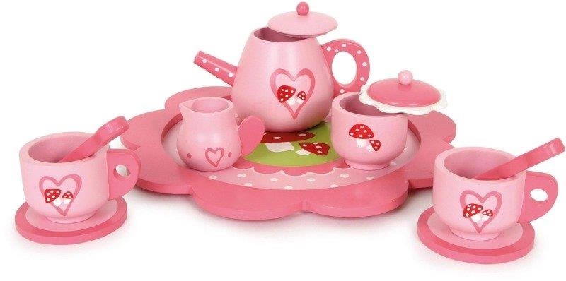 Marzeniem każdej mamusi jest ten serwis na tablecie z 11 dodatkami. Wykonany z lakierowanego drewna, zdobiony motywami muchomorka. Dzbanek, cukierniczka, dzbanuszek na mleko, 2 filiżanki z talerzykami i łyżeczki ozdobią mebelki w dziecięcym pokoju.