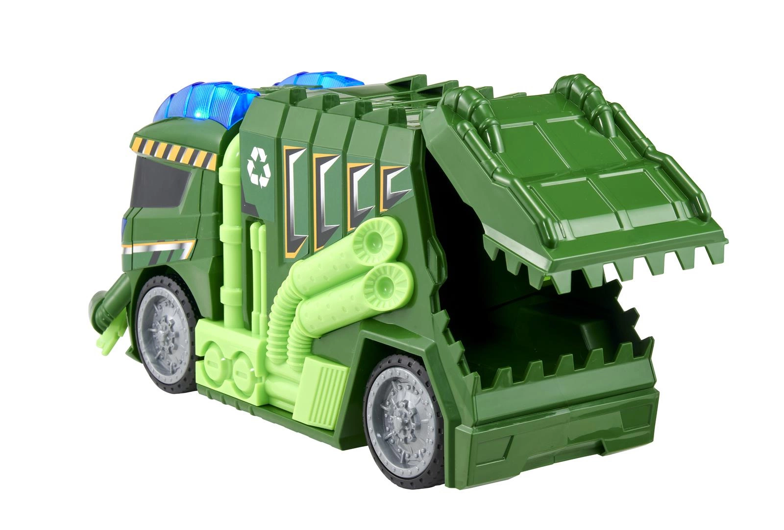 Śmieciarka w stylowej odsłonie! Wyrusz z nią na patrol i przetestuj wszystkie, ekscytujące funkcje tego odjazdowego pojazdu. Wyposażony jest on w ręcznie otwieraną komorę, znajdującą się z tyłu samochodu, oraz łopatki przed maską, które można ręcznie obracać. Na dachu samochodu znajduje się przycisk aktywujący światła dachowe oraz realistyczne odgłosy silnika i muzykę.