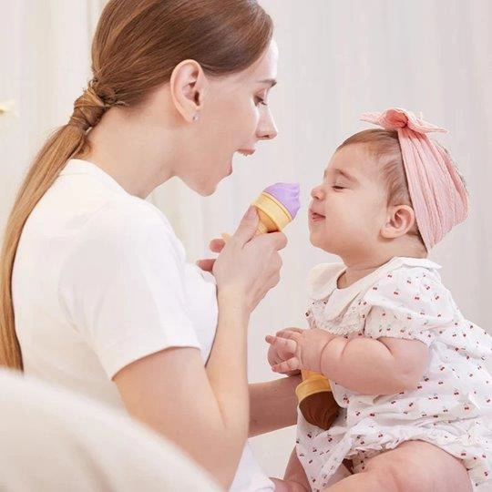 Gryzak chłodzący Smily Mia w kształcie smakowitego loda został stworzony po to, by jeszcze lepiej łagodzić ból i dyskomfort związany z ząbkowaniem. Wystarczy go rozkręcić, wlać wodę do zbiorniczka, umieścić zbiorniczek w zamrażarce, aż do momentu zamarznięcia, następnie wyjąć go, skręcić gryzak i podać dziecku. Maluch nie odmówi sobie pysznych lodów, które dodatkowo schłodzą jego dziąsła, przynosząc ulgę w ząbkowaniu.