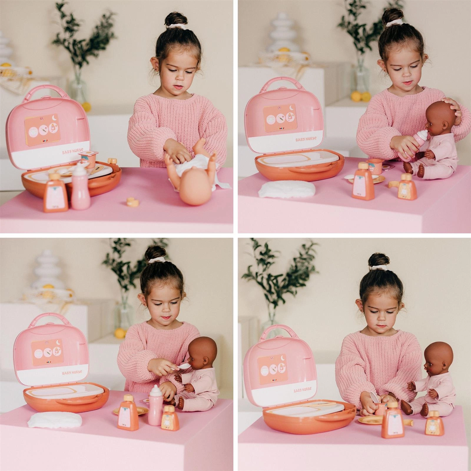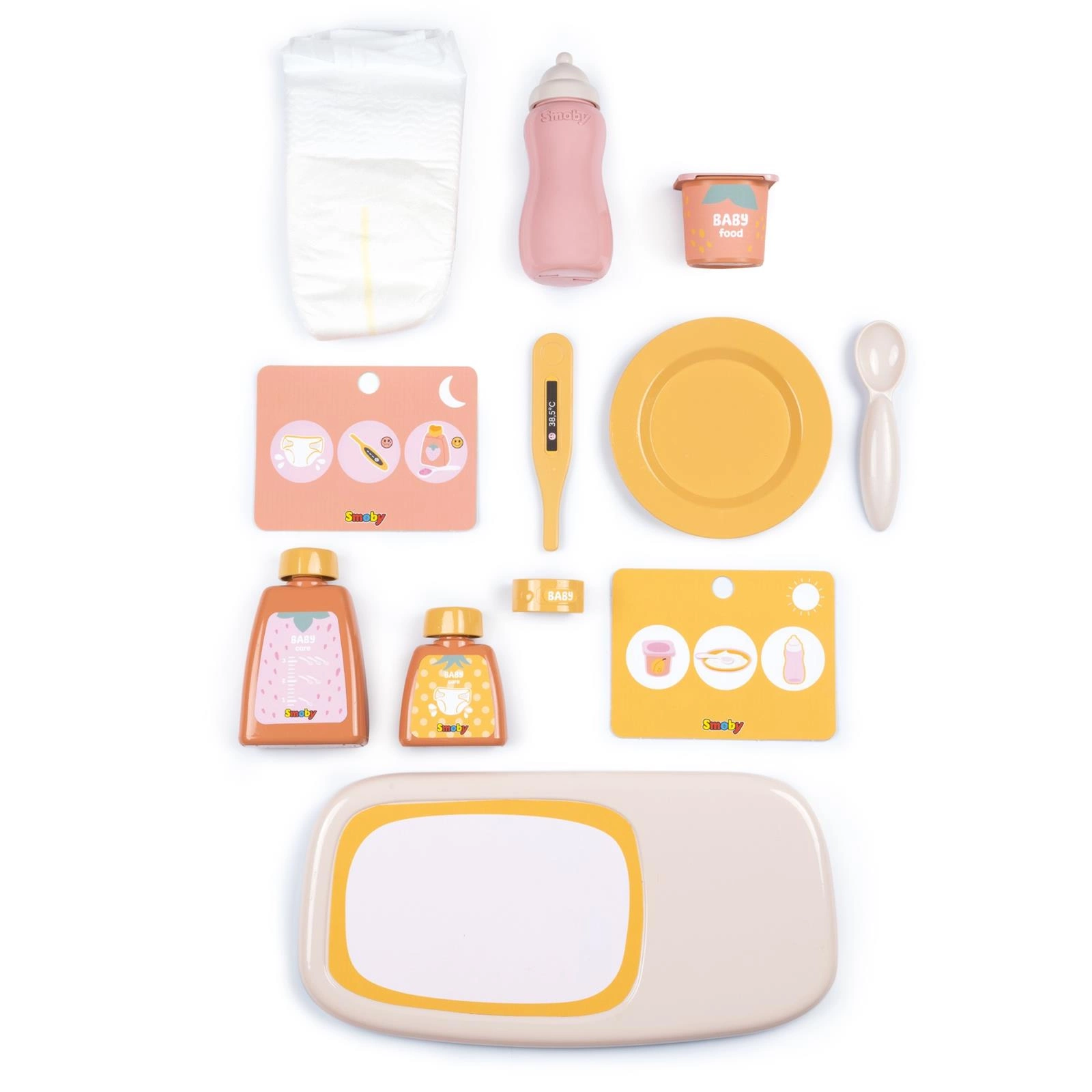 - - W walizce znajdziemy: pampers/pieluszka, buteleczka, imitacja jogurtu, talerzyk, łyżeczka, termometr, opaska na rączkę, 2 buteleczki (imitacja kosmetyku), podkładka, karteczka z planem dnia i nocy