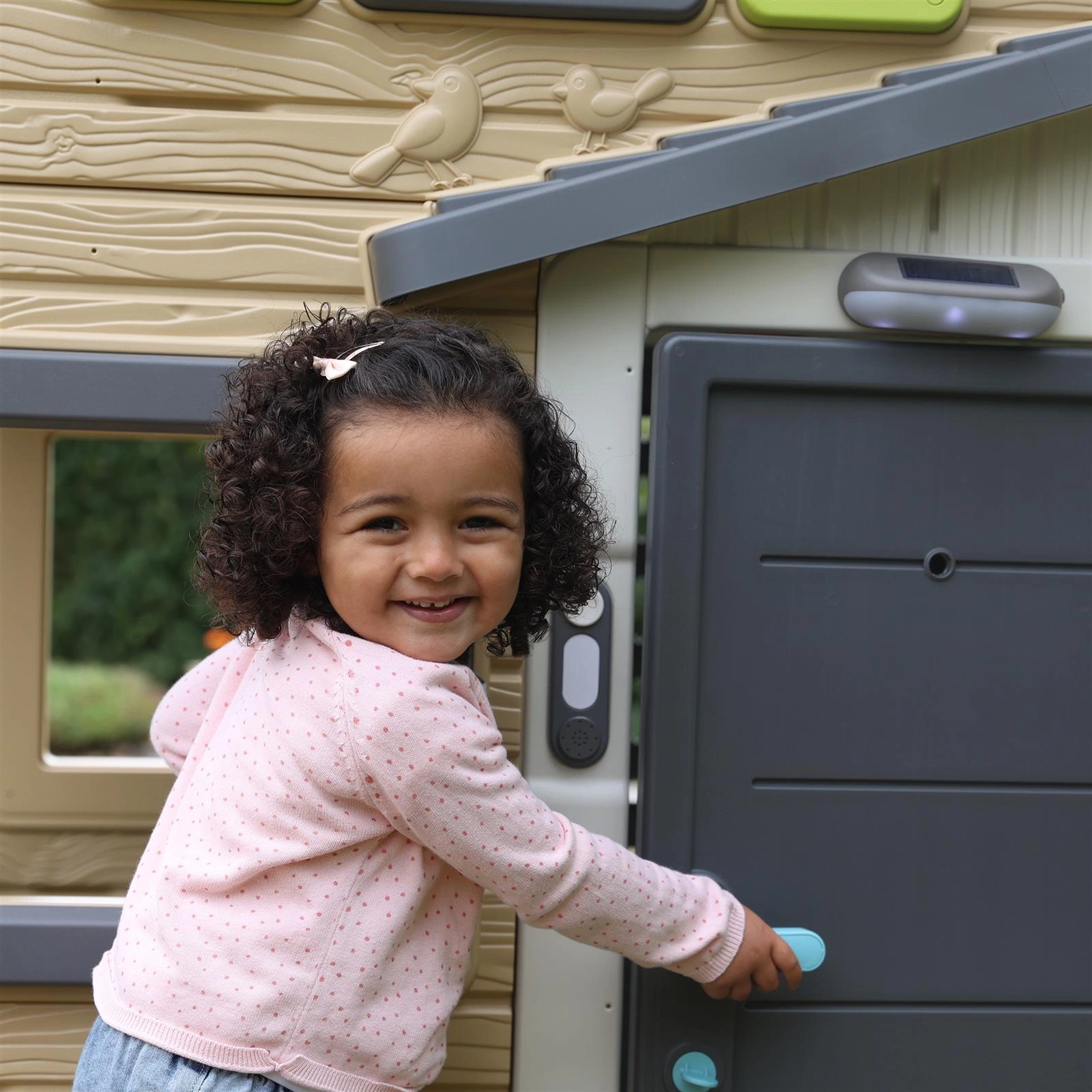 Elektroniczny Dzwonek Doorbell firmy Smoby to zabawka, która pasuje do wszystkich nowoczesnych domków ogrodowych tej marki: Jolie, Lovely, Nature, Pretty, Neo Jura Lodge, Friends House, Friends House Evo, 4 Seasons Playhouse, Sweety Corner Playhouse, Garden House Playhouse, Chef House Playhouse, Dom na Palach. Jest łatwy w montażu i pozwala dzieciom spersonalizować swój domek, pisząc na nim swoje imię. Dzięki dzwonkowi dzieci mogą zapraszać gości do swojego domu, słysząc realistyczny dźwięk dzwonka. Dzwonek ma szary kolor i mały głośnik. Potrzebuje 2 baterii AAA/LR03 (nie dołączonych do zestawu).