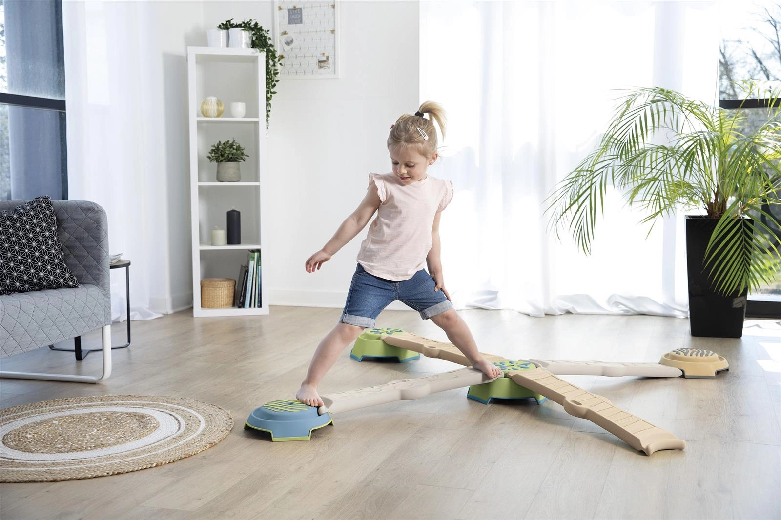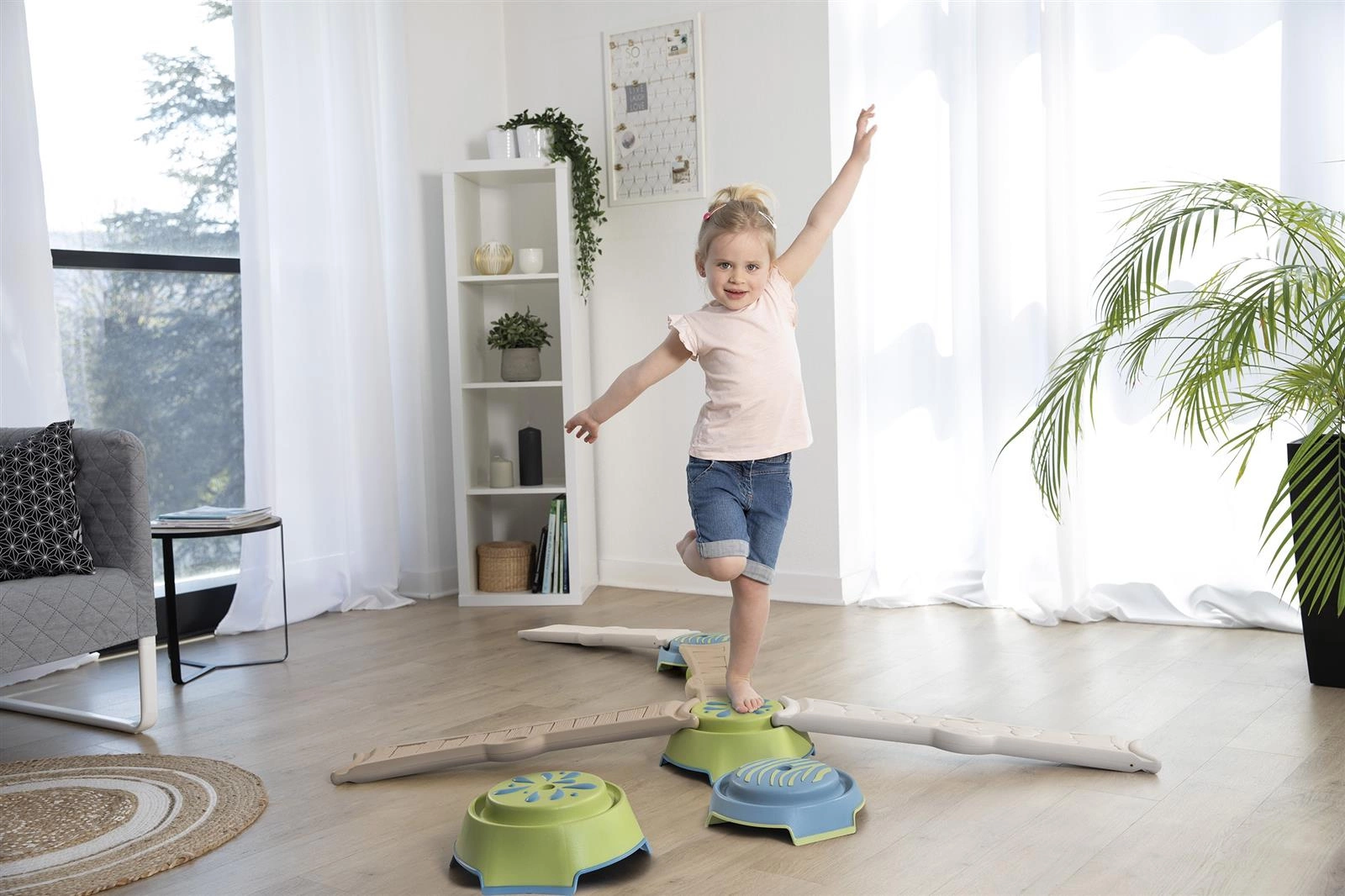 Zestaw składa się z czterech długich (70 cm) paneli o zróżnicowanej fakturze oraz czterech podstaw do ich mocowania. Możliwość dowolnej konfiguracji elementów pozwala stworzyć nawet 3,5-metrową trasę, dostosowaną do umiejętności dziecka. Ścieżkę warto przechodzić na boso, co zwiększa doznania sensoryczne i pozytywnie wpływa na rozwój układu nerwowego.