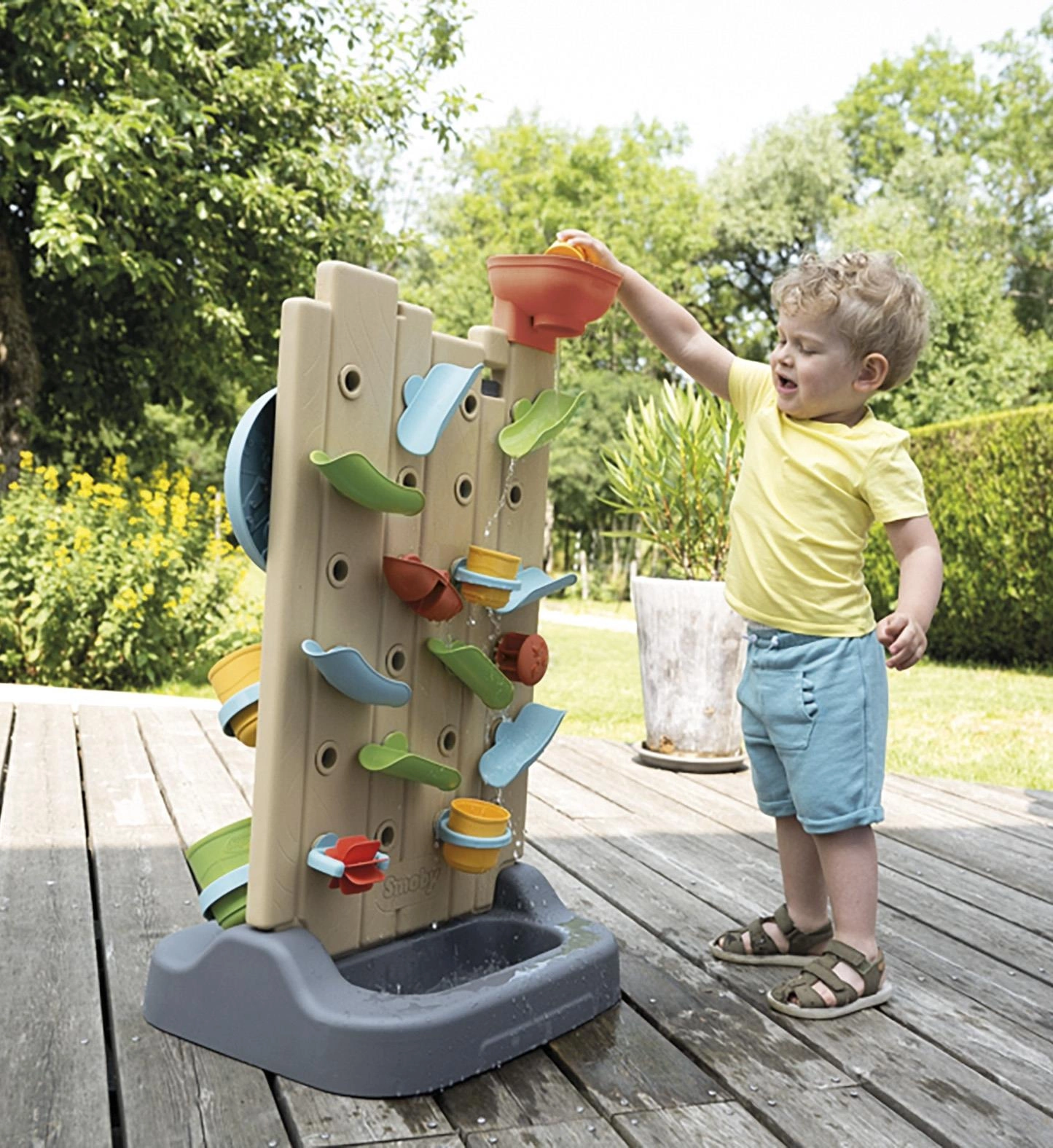- - Zawiera 6 aktywności: zabawy wodne, gra w kółko i krzyżyk, tablica do pisania kredą, sportowe koło, gra w rzucanie piłką oraz interaktywne elementy do tworzenia własnych torów wodnych.