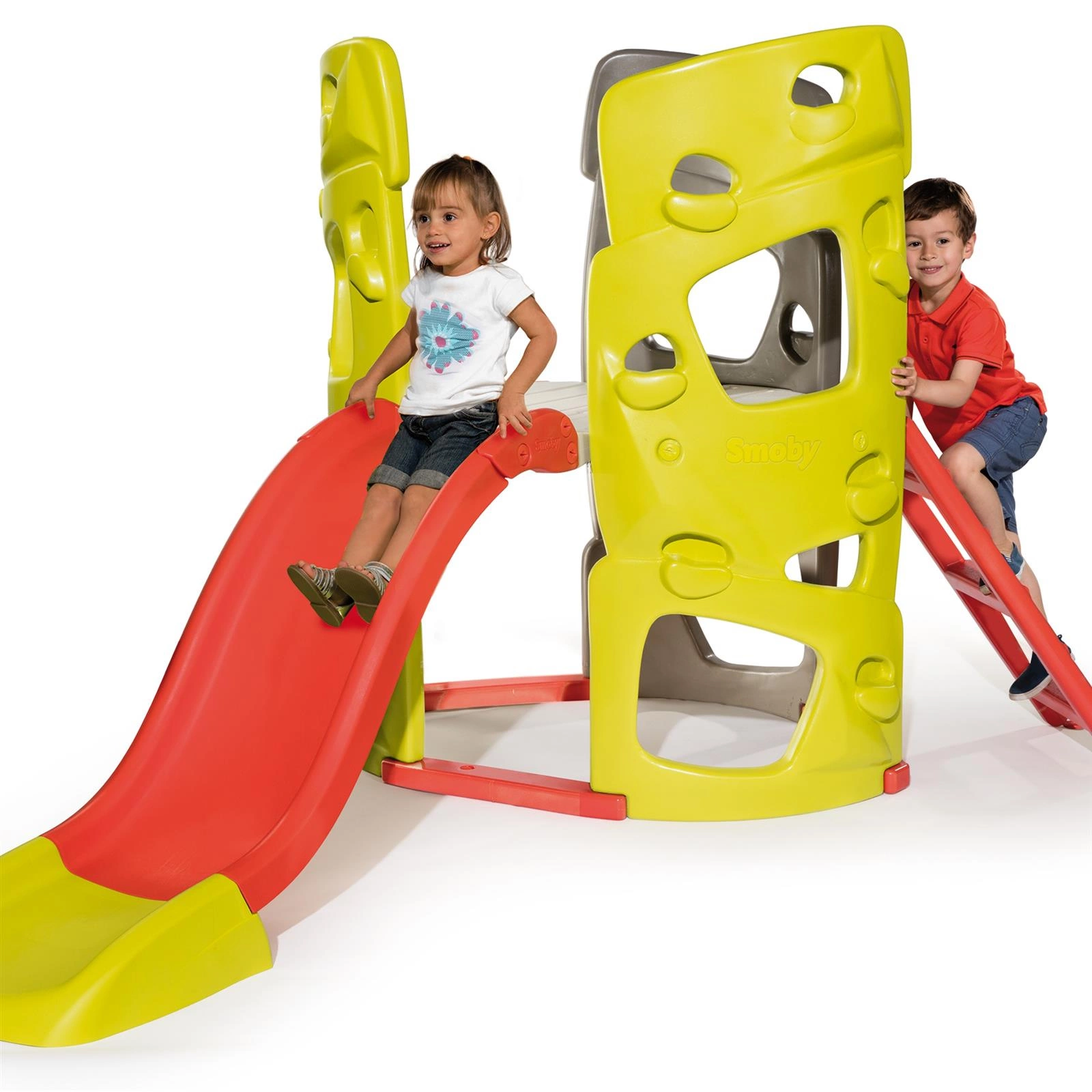 Wieża wspinaczkowa plac zabaw zjeżdżalnia od cenionego francuskiego producenta zabawek dla dzieci firmy Smoby. Maluchy mogą się wspinać, zjeżdżać, wchodzić po drabince, bawić się w chowanego. Na podest dzieci mogą wejść po drabince lub specjalnie do tego stworzonych 3 ściankach do wspinaczki, które posiadają idealne dla dziecięcych dłoni i stóp uchwyty.