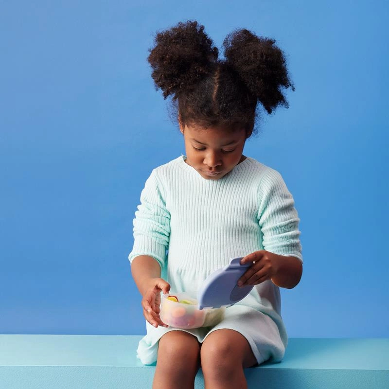 Uniwersalny pojemnik na przekąski z elastyczną uszczelką umożliwiającą schowanie do niego całego owocu takiego jak jabłko. Przegrody są szczelne i można ich używać do przecierów, jogurtów i dipów.