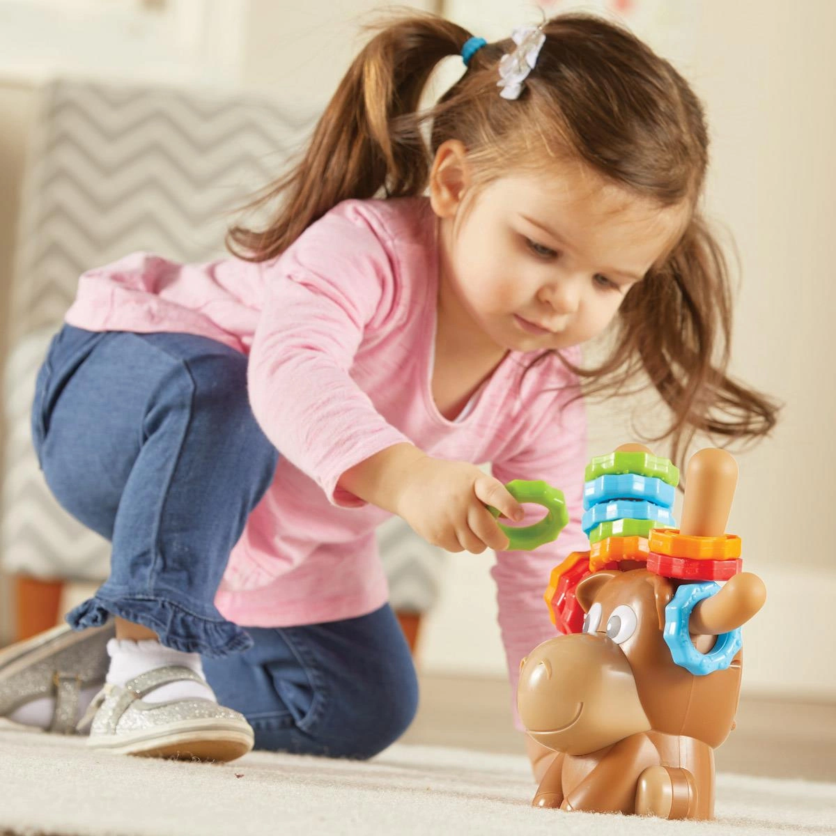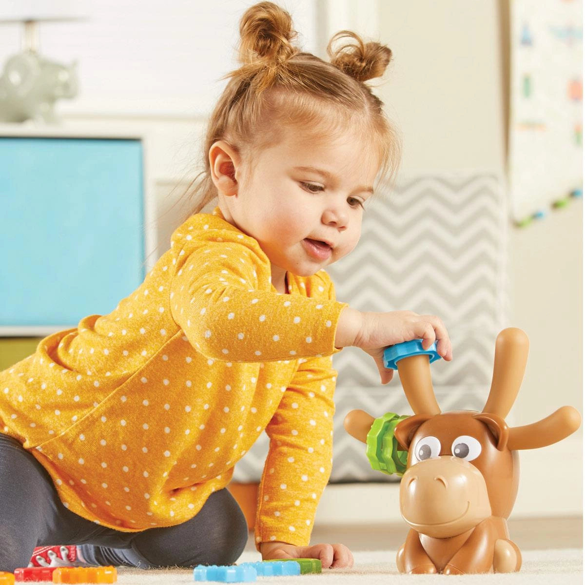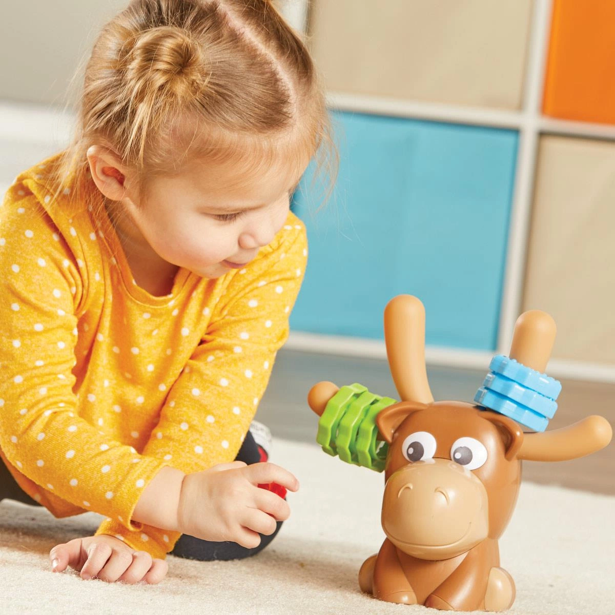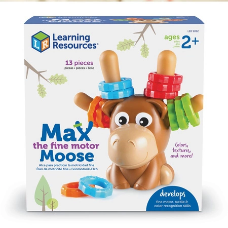 Zabawa polega na zakładaniu i zdejmowaniu pierścieni na rogi Łosia, nazywania ich kolorów, rozpoznawania kształtów i tekstur oraz ukrywaniu ich w skrytce. Zabawny łoś jest wyposażony w 12 pierścieni z łatwymi do uchwycenia powierzchniami, które pomagają maluchom budować koordynację ręka-oko, siłę dłoni i inne niezbędne elementy rozwoju umiejętności motorycznych. 12 pierścieni Maxa ma dwie różne tekstury, które wspierają grę dotykową i wczesną umiejętność uczenia się kolorów.