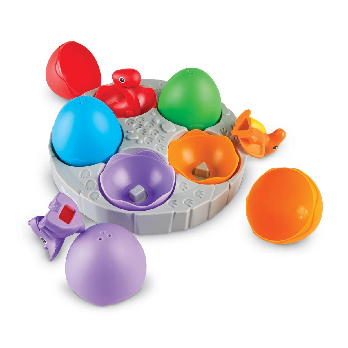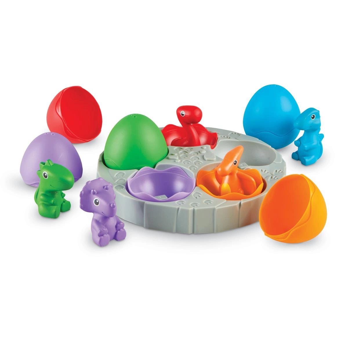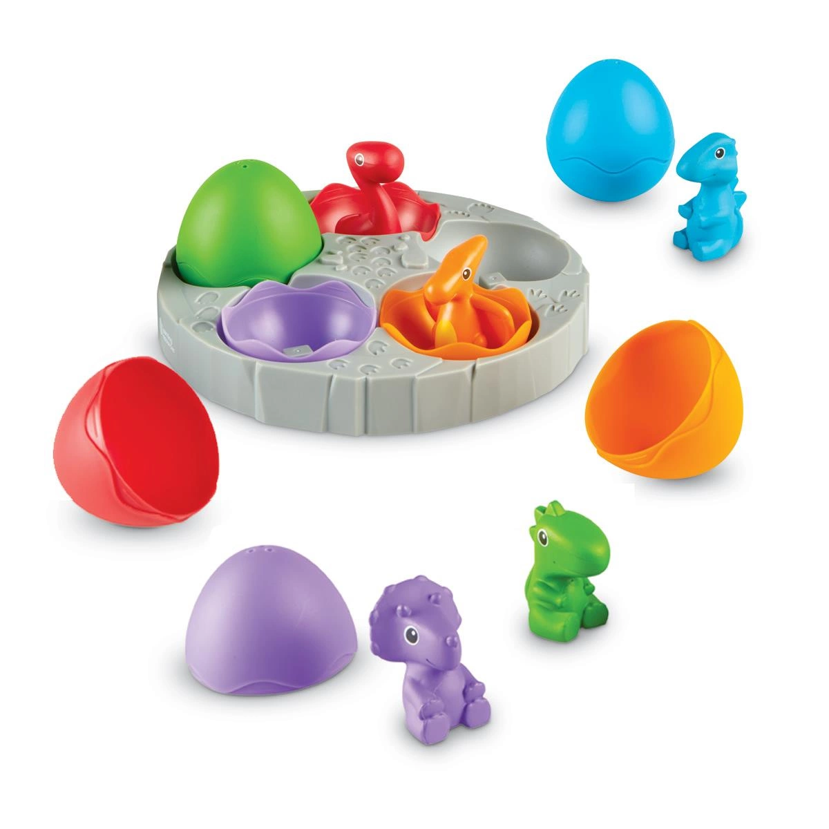 Zabawa polega na wkładaniu, wyjmowaniu, sortowaniu kolorów, dopasowywaniu kształtów lub odgrywaniu ról po nałożeniu na palec. Otwórz 5 jaj z tego zestawu, aby odkryć 5 różnych dinozaurów ukrywających się w środku - jest tam przyjazny Triceratops, Pterodaktyl, T-rex, Apatozaur i nie tylko! Oprócz tego, że są urocze, dinozaury pełnią także funkcję pacynek, które można założyć na palce i rozpocząć prehistoryczną zabawę! Dopasuj kształty. Na spodzie dinozaurów są otwory zróżnicowane kształtem, zgodnym wypustkami wewnątrz jajek - mamy tu kółko, kwadrat, prostokąt, trójkąt. Sortuj nowych przyjaciół według kolorów, układaj i licz! Dinozaury i jajka pasują do dołączonego plastikowego gniazda, więc kiedy tylko zabawa się skończy, możesz je tam schować, aby poczekały na kolejną fantastyczną zabawę! Odkryj nasz wybór kreatywnych zabawek, które zachęcają dzieci do praktycznego uczenia się i rozwoju poprzez kreatywność i wyobraźnię. Dzieci uczą się: dopasowywania, rozpoznawania gatunków, kolorów i kształtów, liczenia, porównywania, doskonalenia umiejętności motorycznych oraz rozbudzania emocji.