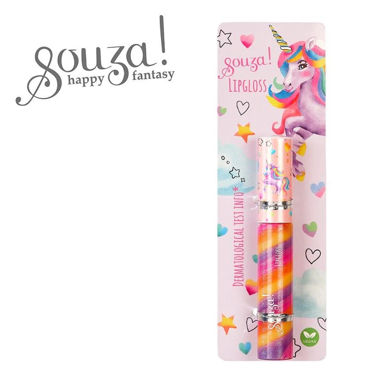 Tęczowy błyszczyk do ust dla dzieci Jednorożec holenderskiej marki Souza! Ma lekką formułę i przyjemny, niedrażniący zapach. Pozostawia na ustach lśniące wykończenie.