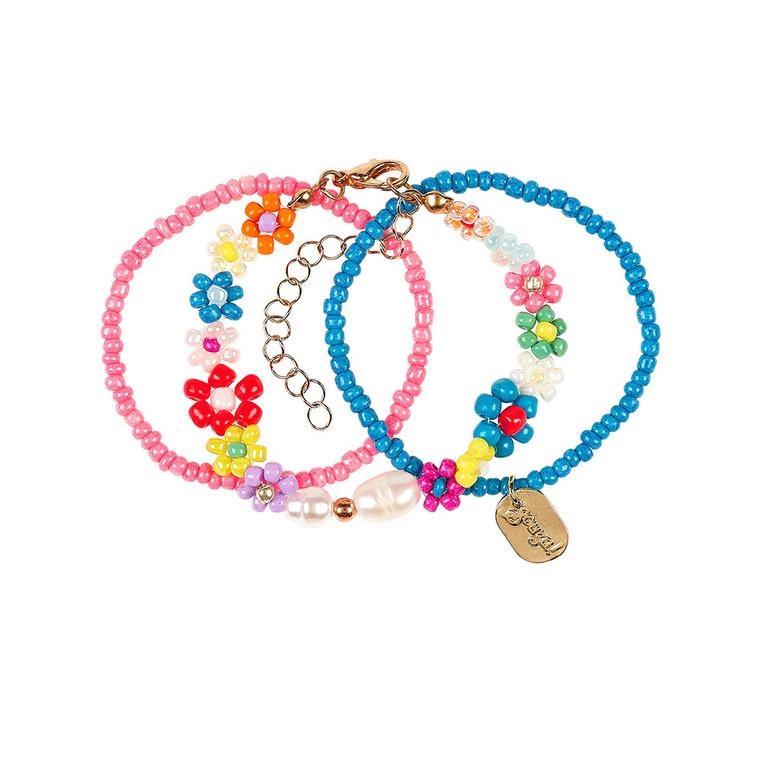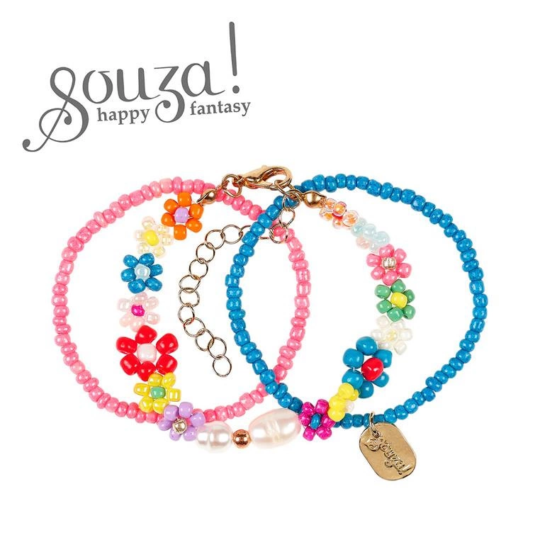 Komplet 3 bransoletek z koralików Loiz holenderskiej marki Souza! o średnicy 15 cm każda. Wykonane z koralików: jedna różowa, jedna niebieska i jedna wielokolorowa z koralikowych kwiatków i regulowanym zapięciem. Wygodne do nakładania. Biżuteria jest nietoksyczna i nie podrażnia skóry. Idealna zarówno na przyjęcia, jak i na co dzień. Sprawdzą się także jako prezent.