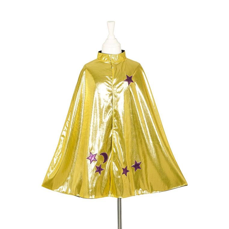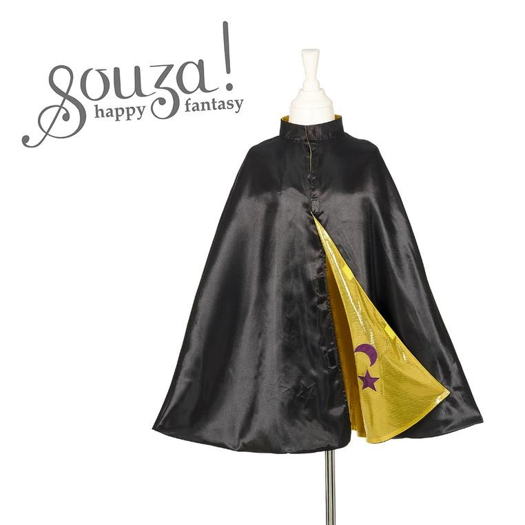 Kostium peleryna dwustronna Magik/Nietoperz holenderskiej marki Souza! to przepiękne, kunsztownie wykonane przebranie, które zachwyca dbałością o detale. Peleryna jest rozkloszowana i efektowna. Z jednej strony czarna, z wyszywanym na plecach złotym nietoperzem, z drugiej – błyszcząca, złota, ozdobiona fioletowymi aplikacjami gwiazd i księżyca. Ma elegancką stójkę, zapinana jest na rzepy, a przy tym miękka i komfortowa w noszeniu. To idealny strój na bal przebierańców, Halloween, Sylwestra czy urodziny. Doskonale sprawdzi się także jako prezent.