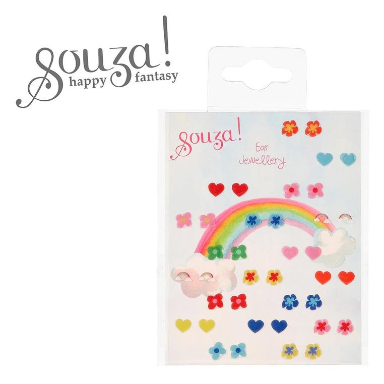 Zestaw kolczyków samoprzylepnych Kwiaty i serca holenderskiej marki Souza! W jego skład wchodzi 38 sztuk (19 par) drobnych kolczyków w różnych kolorach i kształtach – serduszek, kwiatów oraz tęczy.