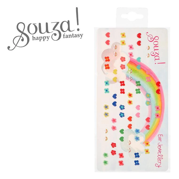 Zestaw kolczyków samoprzylepnych Kwiaty i serca holenderskiej marki Souza! W jego skład wchodzi 70 sztuk (35 par) drobnych kolczyków w różnych kolorach i kształtach – serduszek, kwiatów oraz tęczy.