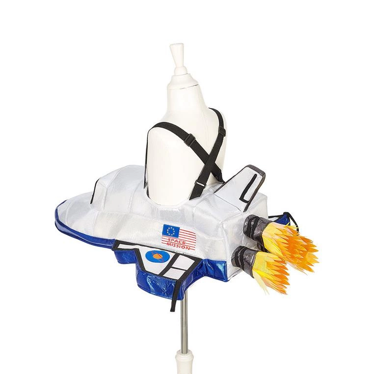 Kostium rakiety astronauty holenderskiej marki Souza! to niezwykle efektowne przebranie typu ride-on, które z pewnością przyciągnie uwagę. Duża, trójwymiarowa rakieta w srebrno-niebieskich kolorach ma wydłużony dziób, boczne skrzydła i płomienie imitujące pracujące silniki z tyłu. Dzięki szerokim szelkom i dużemu otworowi strój jest lekki, wygodny i łatwy do samodzielnego założenia. Może pełnić rolę niezależnego kostiumu lub stanowić doskonałe uzupełnienie stroju astronauty. Idealny na bal przebierańców, szkolne przedstawienie, a nawet sylwestrową zabawę. Świetnie sprawdzi się także jako oryginalny prezent.