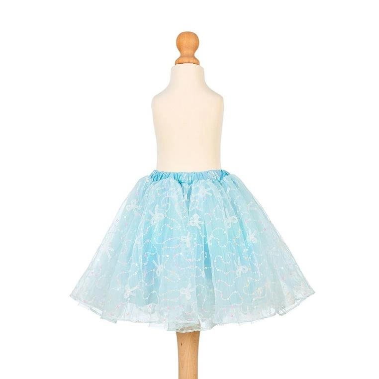 Ma klasyczny rozkloszowany krój, gumkę w pasie i połyskującą ozdobną taśmę wokół talii. Zachwyca dbałością o detale. Składa się z niebieskiej podszewki i kilku warstw transparentnego tiulu, z których zewnętrzna jest ozdobiona srebrnymi cekinami. Komfortowa do noszenia.