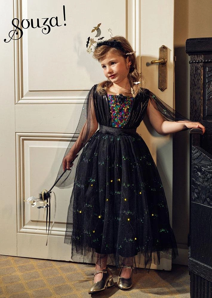 Kostium sukienka z lampkami LED czarownica Agatha holenderskiej marki Souza! to przepiękne i kunsztownie wykonane przebranie dla dziewczynki, które zachwyca dbałością o detale. Sukienka ma klasyczny krój z długimi tiulowymi rękawami, częściowo ozdobionymi cekinami. Góra wykonana jest z różnych materiałów i zdobiona wstawką z kolorowych cekinów na dekolcie. Wielowarstwowa czarna spódnica posiada natomiast: wierzchnią warstwę tiulu ozdobioną cekinami, odpinaną warstwę z przewodem i bezpiecznymi lampkami LED oraz satynową podszewkę zapewniającą wygodę. Dzięki gumce w pasie sukienka jest wygodna i komfortowa w noszeniu.