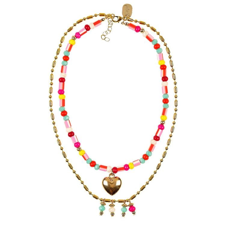 Naszyjnik 2w1 Syta holenderskiej marki Souza! składa się ze złotego łańcuszka i rzędu sporych kolorowych koralików z zawieszką w kształcie serca. Ma 42 cm długości i regulowane zapięcie. Jest wygodny do nakładania. Biżuteria jest nietoksyczna i nie podrażnia skóry. Idealna zarówno na przyjęcia, jak i do noszenia na co dzień. Sprawdzi się także jako stylowy prezent.