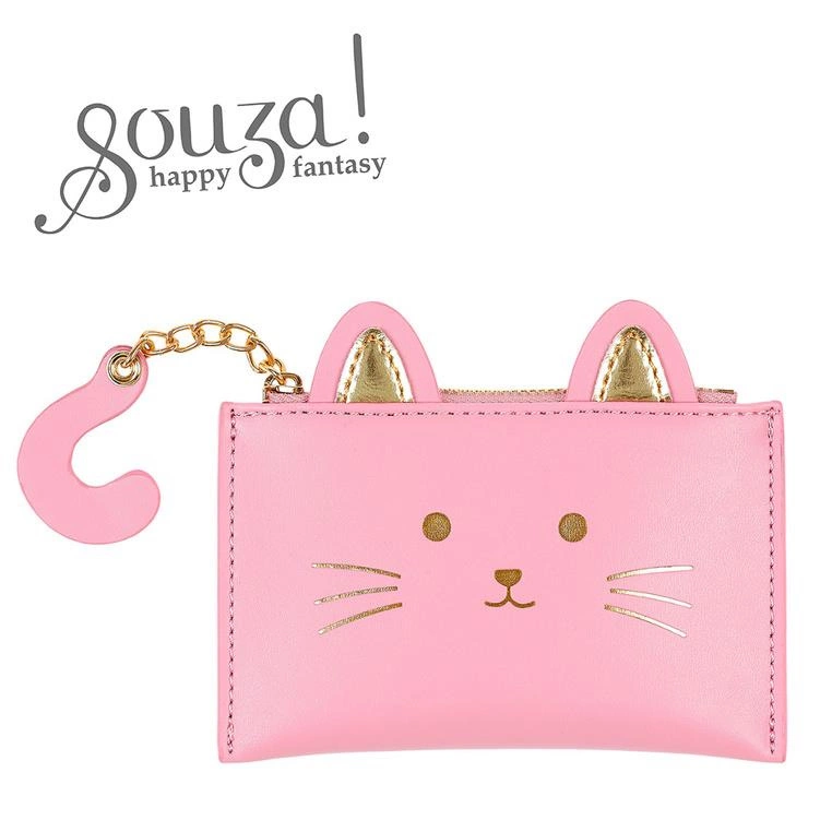Portfel-saszetka dla dzieci Kiki holenderskiej marki Souza! Ma poręczny, płaski kształt, zapinany jest na suwak i uroczy, różowy kolor. Z przodu znajduje się złoty rysunek kociej mordki, a u góry – wystające kocie uszka. Złoty suwak zdobi łańcuszek z różowym kocim ogonkiem.