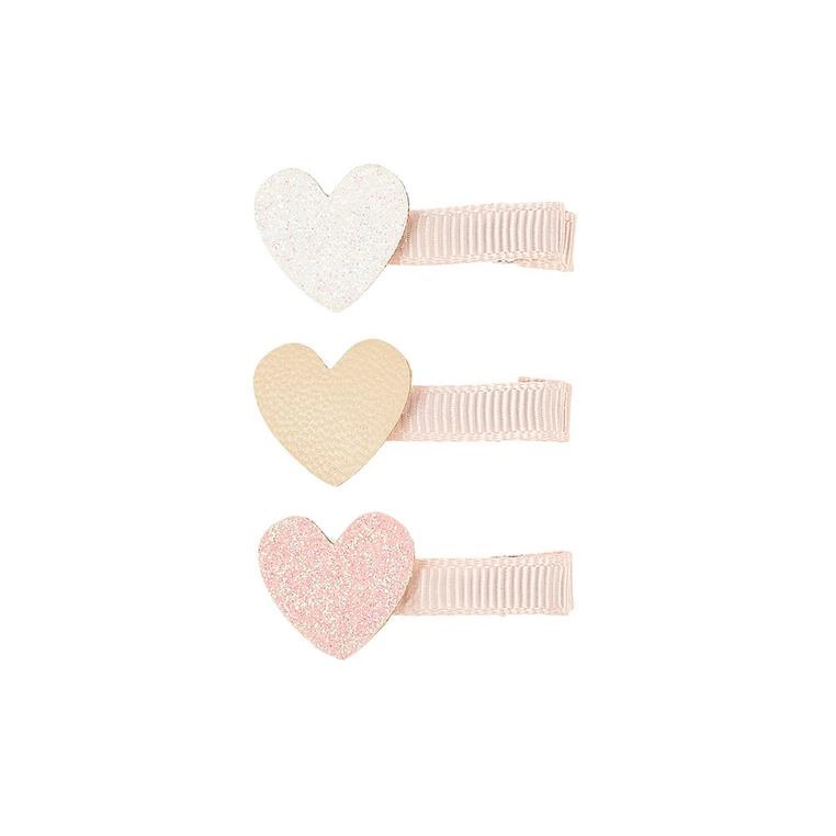 Komplet trzech spinek do włosów z sercami Bracha holenderskiej marki Souza! Na każdej z nich znajduje się inna aplikacja: brokatowe biała i jasnoróżowa oraz kremowa z ekoskóry. Metalowa część spinek pokryta jest materiałem (rypsową wstążką). Ząbkowane zaciski sprawiają, że ozdoby stabilnie trzymają się włosów.