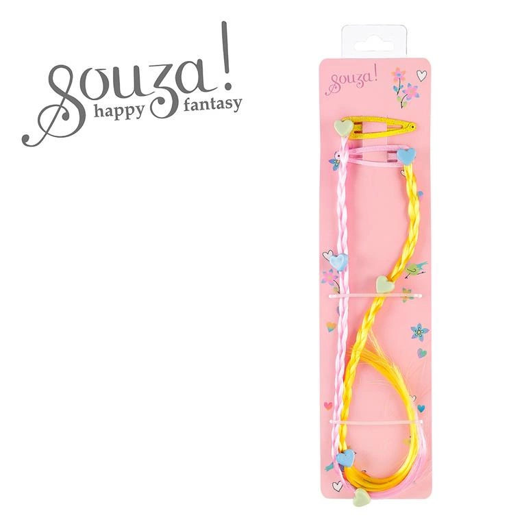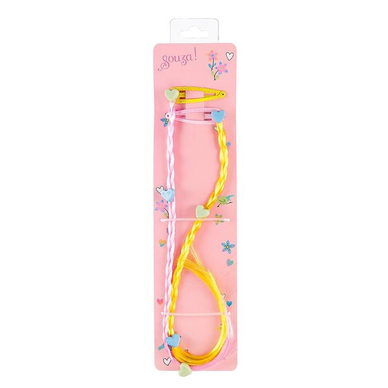 Komplet dwóch spinek do włosów – doczepianych warkoczyków Ulla holenderskiej marki Souza! Jeden warkoczyk jest jasnoróżowy, a drugi – ciemnożółty, na każdym z nich znajdują się niebieskie i miętowe aplikacje-serduszka. Zaciski na klik sprawiają, że ozdoby stabilnie trzymają się włosów. Idealne zarówno na przyjęcia, jak i na co dzień. Nadają się także na prezent.