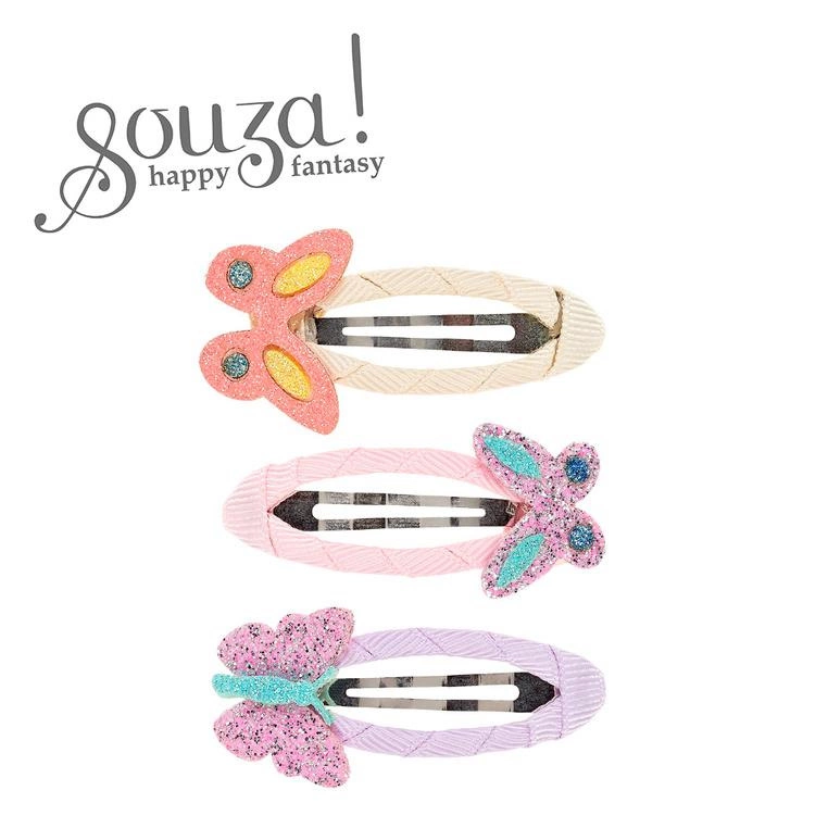 Komplet trzech spinek do włosów z brokatowymi motylami Xeni holenderskiej marki Souza! Na każdej z nich znajduje się brokatowa aplikacja – motylek. Metalowa część obciągnięta jest wokół materiałem. Zaciski na klik sprawiają, że ozdoby stabilnie trzymają się włosów. Idealne zarówno na przyjęcia, jak i na co dzień. Nadają się także na prezent.
