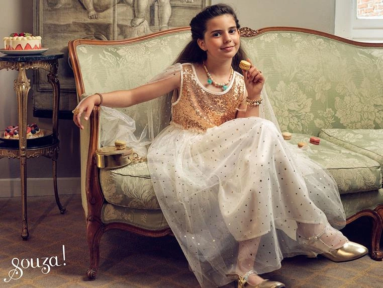 Sukienka wizytowa z długimi rękawami Dorianne holenderskiej marki Souza! to przepiękne, kunsztownie wykonane ubranie dla dziewczynki. Zachwyca dbałością o detale, ma klasyczny krój i gumkę w pasie, która zapewnia komfort noszenia. Góra sukienki wykonana jest z błyszczących, złotych cekinów, natomiast wyjątkowo długie, rozszerzane rękawy oraz spódniczka uszyte są z kremowego tiulu z drobnym wzorem w złote gwiazdeczki, co nadaje całości bajkowego charakteru. To idealna sukienka na wyjątkowe okazje i wszelkie przyjęcia (np. wesele czy urodziny), bale przebierańców czy Sylwestra. Sprawdzi się także jako prezent.