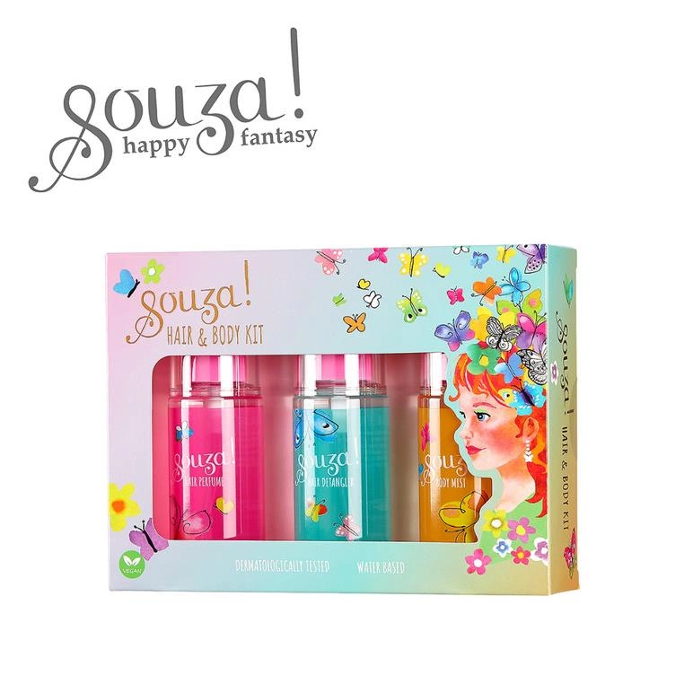 Zestaw trzech mgiełek do włosów i ciała dla dzieci holenderskiej marki Souza! o przyjemnym, owocowym zapachu. W zestawie znajduje się: spray ułatwiający rozczesywanie (hair detangler), odświeżająca mgiełka do ciała (body mist) oraz zapach do włosów (hair perfume), które są idealne do codziennego użytku. Każde opakowanie ma pojemność 50 ml i wyposażone jest w praktyczny atomizer, który ułatwia aplikację. Całość zapakowana jest w kartonowe pudełeczko z przezroczystym okienkiem.